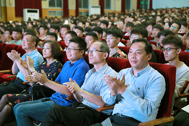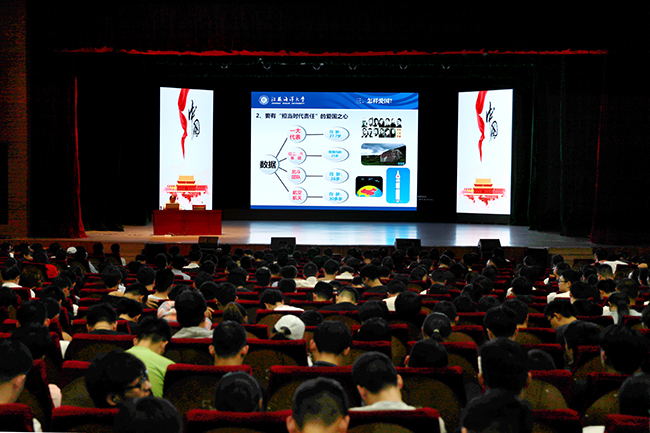 王自力的授课视野开阔,逻辑严谨,有高度、接地气、冒热气,话语间饱含爱国荣校的浓郁情感,赢得了现场师生的阵阵掌声。