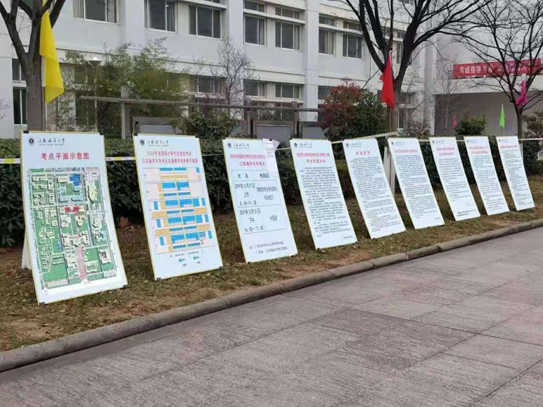 考试前期,副校长许兴友、严云洋分别多次主持召开了考务工作协调会,精密安排部署考务工作。在省、市教育考试院的关心和指导下,研究生处结合我校实际制定了《2020年全国硕士研究生招生考试江苏海洋大学考点考务工作方案》,明确了实施程序和各小组工作职责,并分别在三个校门、主干道、考场内等显著位置设置指示图(牌)和考场安排表,并安排志愿者进行引导;教务处加强了考务工作人员配备和培训,选聘监考员、流动监考员150余人,按照《江苏省2020年全国硕士研究生招生考试考务工作规定实施细则》要求对不同岗位人员先后开展了多轮个性化培训,学习考务工作手册,签订责任书,严格要求,严肃纪律,明确职责,熟悉规程,考务人员经考核合格后方可上岗;宣传部在校园内设置拱门、悬挂醒目的“2020年全国硕士研究生招生考试江苏海洋大学考点”横幅、安插彩旗,在电子大屏制作了与考试相关的精美宣传标语画面,营造既庄重又和谐的气氛;校长办公室、信息化处、保卫处、后勤管理处等部门密切配合,通力合作,分别动员大量工作人员投入保障服务,对考场和相关设施进行了精心维护调试,所有考场安排考务通对考生进行身份证和人脸识别验证,所有考场全程录音录像并实时上传省教育考试院。