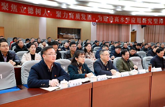 王自力指出,在主题教育中,我校党员、干部围绕“理论学习有收获、思想政治受洗礼、干事创业敢担当、为民服务解难题、清正廉洁作表率”五大目标,在主题教育中收获丰硕、成效显著。理论武装进一步强化,习近平新时代中国特色社会主义思想更加入脑入心;政治站位进一步提高,“四个意识”更加牢固,“四个自信”更加坚定,“两个维护”更加自觉;责任担当进一步增强,推动“内涵”建设更加有力;宗旨意识进一步巩固,师生反映强烈的热点难点问题得到有效解决;作风建设进一步加强,清正廉洁的政治生态得到有效巩固;内部治理进一步优化,党建工作基础更加扎实。本次主题教育也为我们进一步加强党的建设和党员、干部教育积累了宝贵的经验。