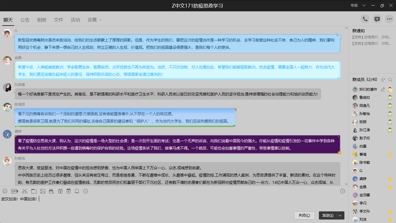 “思政大课”观看结束后,各学院灵活运用多种方式展开热烈讨论。大家通过在线课堂作业、QQ群讨论、上传视频、撰写心得文章等方式,把自己的所思所想与同学、老师分享交流。