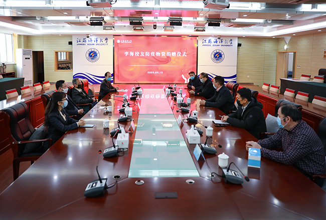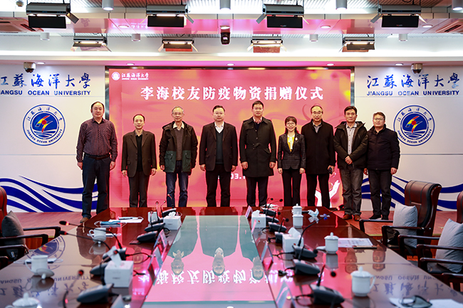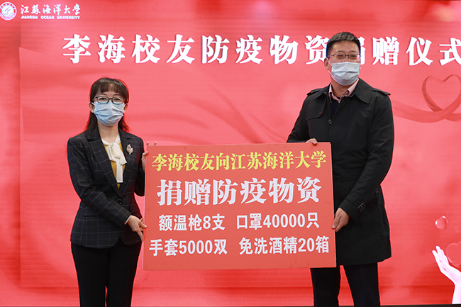 捐赠仪式上,金芙蓉副校长代表江苏海洋大学接受捐赠物资。此次李海校友共向母校捐赠额温枪8支、口罩40000只(先期到货6000只)、手套6000双、免洗酒精20箱。校友总会会长刘永强为李海校友颁发捐赠证书。