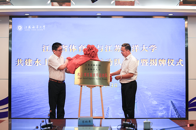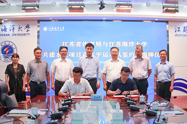 江苏省体育局副局长熊伟、江苏海洋大学副校长严云洋代表双方在共建水上项目高水平运动队合作协议上签字。