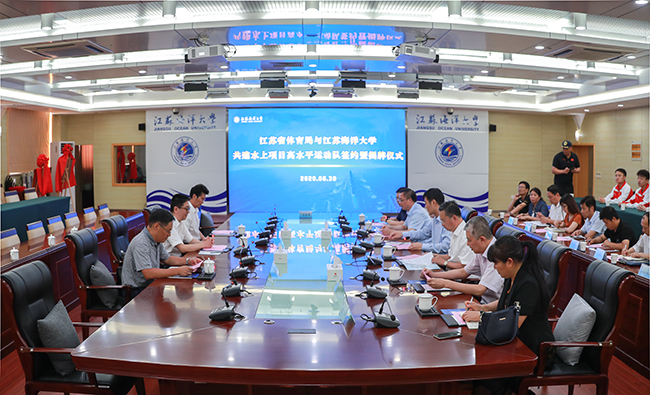 6月30日下午,我校与江苏省体育局共建水上项目高水平运动队签约及揭牌仪式在会议中心东海厅举行。江苏省体育局副局长熊伟,连云港市副市长魏爱春,江苏海洋大学校长宁晓明、副校长严云洋出席了签约仪式。仪式由副校长严云洋主持。学校水上运动队教练员运动员代表参加了签约仪式。
