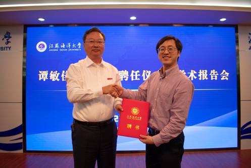 校长宁晓明向谭敏佳教授颁发了柔性引进特聘教授聘书,并向他表示热烈欢迎,对其取得的研究成果给予了高度评价。宁晓明在讲话中指出,对于高层次人才,不求为我所有,但求为我所用,希望谭敏佳教授的加盟,可以促进江苏海洋大学药学院和中科院上海药物所的合作,进一步带动提升我校药学学科的科研水平,实现资源双赢,力争产出更多高水平科研成果。