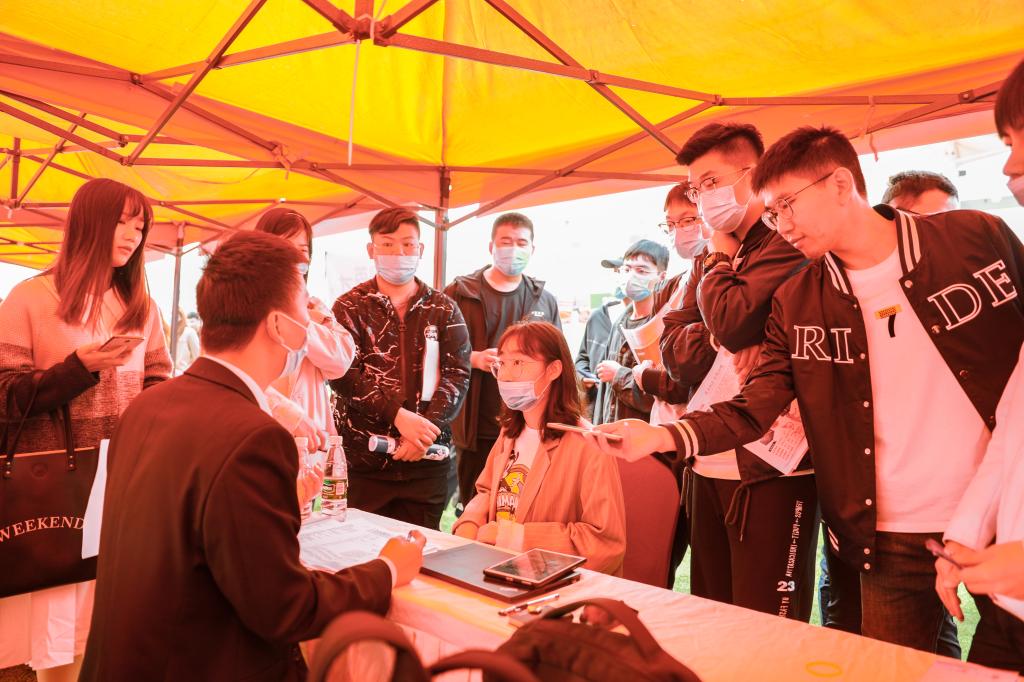 此外,场地和进场方式也与往年不同。应疫情防控需要,招聘会从体育馆内转到室外,开阔的场地更加安全放心,也能承接更多的企业展位,更加便于毕业生与招聘单位面试详谈。进场流程严格把关,测量体温、出示苏康码两者缺一不可。同时我校大学生创业者协会和部分学院志愿者也在会场各处辅助招聘工作,为参会的企业和同学提供便利,维护整体秩序。从招聘会开始到结束,学校都尽力为我校5800多名毕业生营造安全有序的招聘、面试环境。