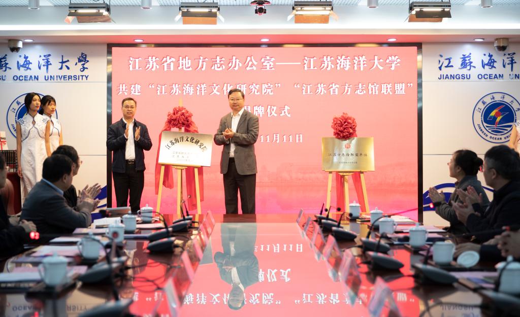 双方代表签署了战略合作框架协议,将在地方志学科建设、理论研究、资源开发利用、方志文化推广等方面深化战略合作。为充分发挥双方学术人才和学术资源优势,省地方志办公室、江苏海洋大学、江苏新闻广播联合推出“海上丝绸之路江苏寻迹”专栏,省地方志办公室与江苏海洋大学合作共建“江苏海洋文化研究院”,联合开展海洋文化类课题项目研究,承接相关部门关于海洋强省建设等方面的项目。“江苏海洋大学海洋经济文化研究中心”加入“江苏省方志馆联盟”,共同打造区域特色文化品牌。左健伟、宁晓明共同为“江苏海洋文化研究院”和“江苏省方志馆联盟”揭牌。