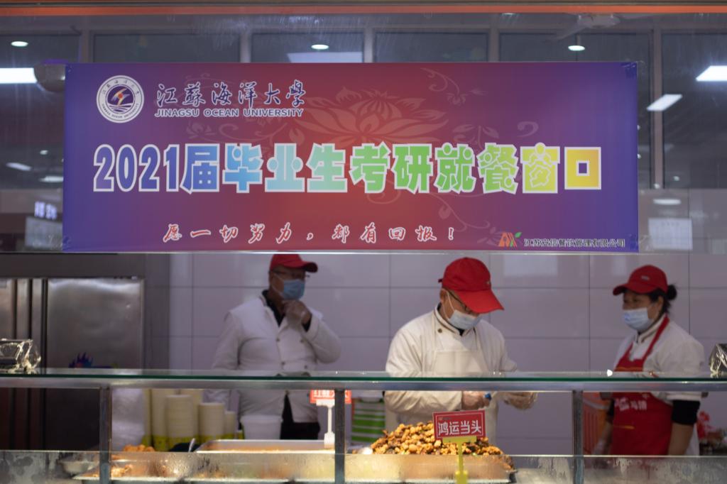 饮食服务公司单独设置考研就餐窗口,精心设计了美好寓意的“考研加油餐”,并准备了新鲜可口的橘子。学生工作处发放1800份考研餐券,每人30元,考生凭考研餐券,不仅可以吃到“加油餐”,还可以获得一“橘”成名。学校还有许多师生自发倡议错峰就餐,优先让考研学子用餐。