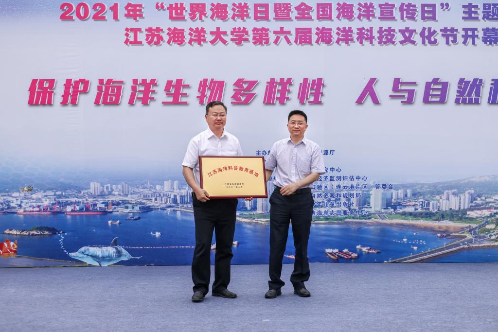 开幕式上,江苏省自然资源厅授予我校“江苏海洋科普教育基地”铜牌,宁晓明校长代表我校接受授牌。
