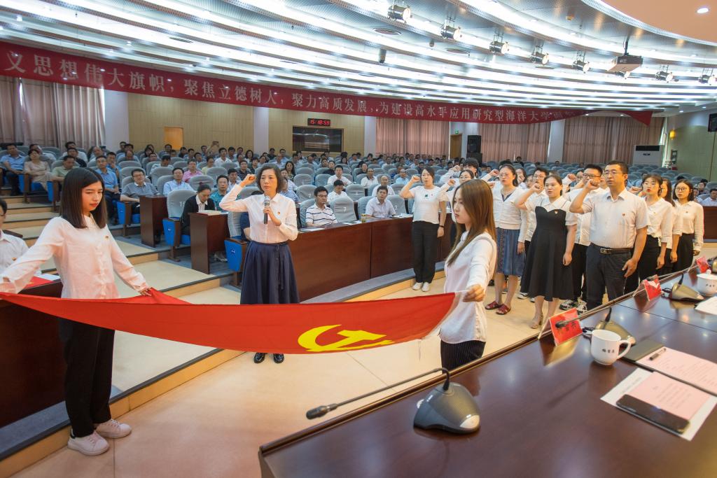 大会现场,还举行了新党员入党宣誓仪式。各基层党组织新党员代表在主席台前列队,在校党委常委、党委宣传部部长杨雪英的带领下,面向鲜红的中国共产党党旗,举起右拳,进行了入党宣誓,铮铮誓言响彻全场。