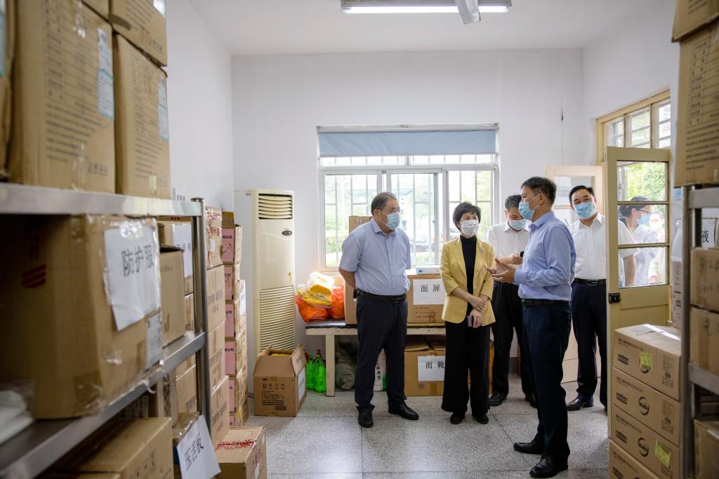 顾月华一行实地察看学校图书馆、食堂、防疫物资仓库、医务室等校内重点场所管理情况,深入了解学校疫情防控相关方面工作,特别是对师生健康状况排查、防控物资储备、校园环境整治、封闭校园管理、应急处置流程等情况进行重点督查,对督查中发现的问题及时提出整改要求。