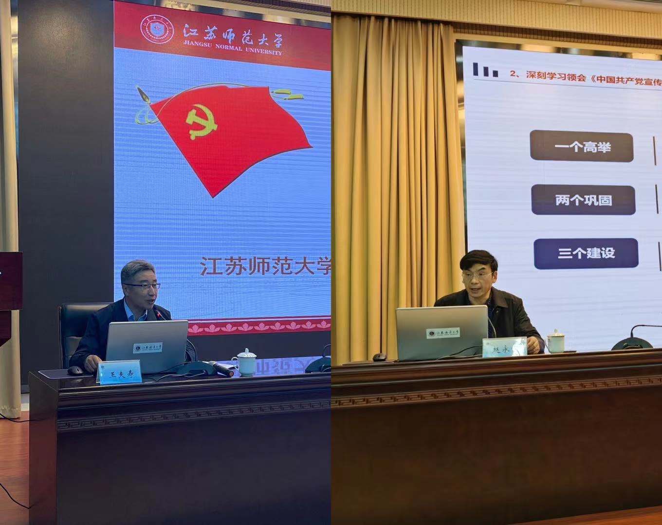 江苏师范大学党委组织部副部长王夫寿结合工作实践,聚焦党日活动开展的“新”“实”“合”“活”“细”“广”等六个关键词,分享了主题党日活动的创新途径。江苏师范大学党委宣传部副部长赵永前从高校党的宣传思想工作的重要意义、具体要求和实际问题出发,全面深入地讲解了新形势下做好高校党组织宣传思想工作的路径和方法。