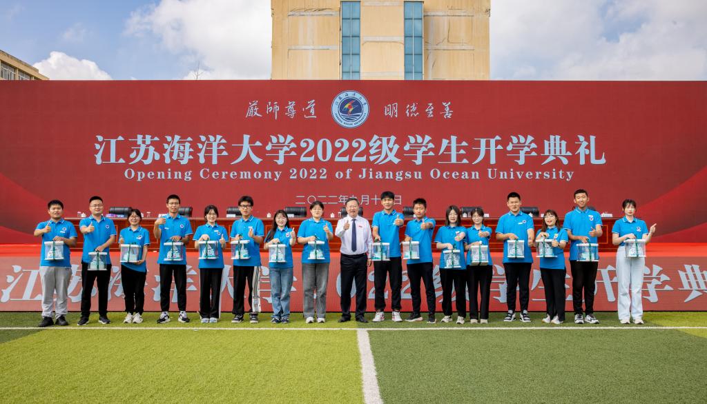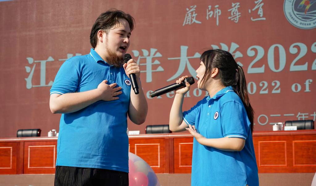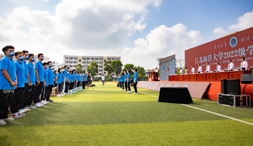 最后,校学生会执行主席邓振国同学带领2022级新生进行了入学宣誓,全场师生齐唱江苏海洋大学校歌《蔚蓝的信仰》。