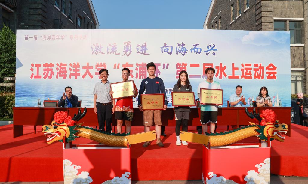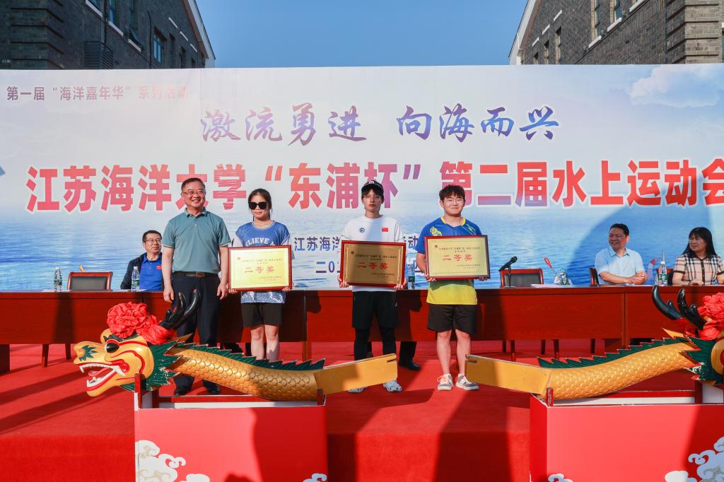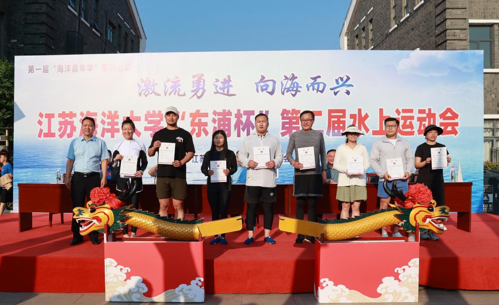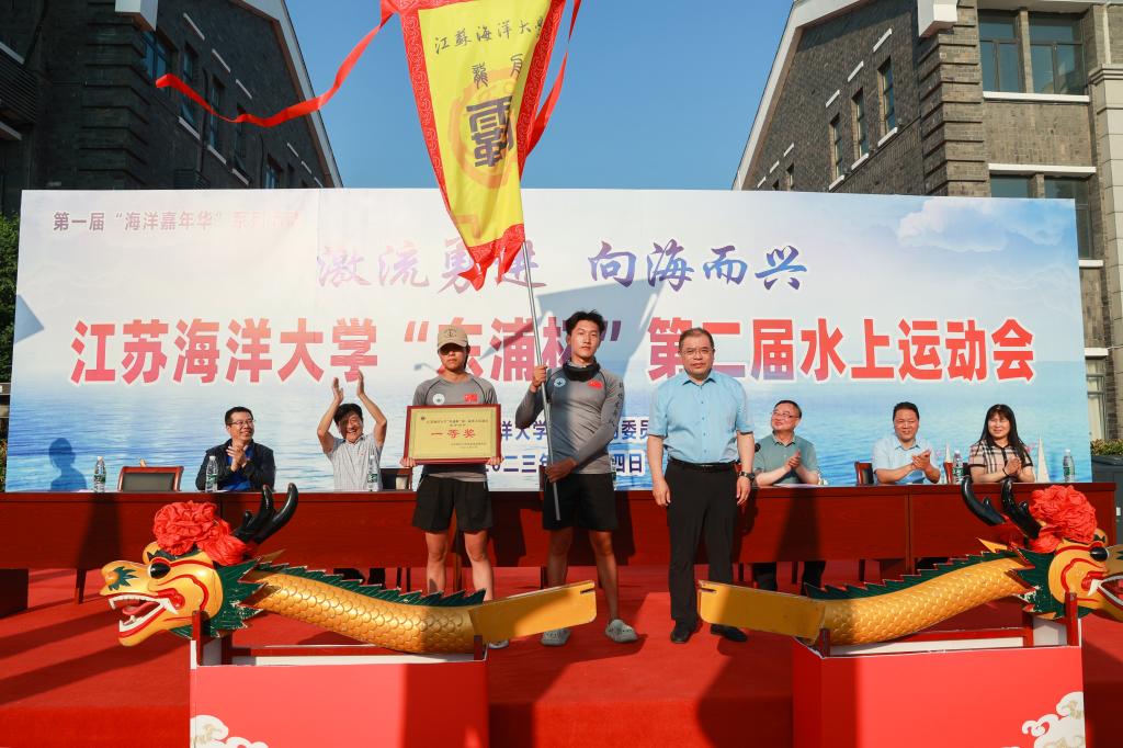 校党委书记王自力为龙舟争霸赛一等奖获奖单位颁奖并授予“霸主旗”。“激流勇进 向海而兴”东浦杯第二届水上运动会也是我校第一届海洋嘉年华系列活动之一,现场展示了习近平论海洋强国宣传展板,让广大师生关注海洋事业发展,提升保护海洋资源,关爱海洋生态环境意识。
