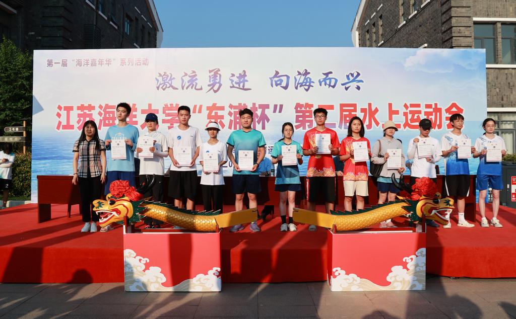 校党委书记王自力和江苏东浦管桩有限公司党委书记谭学立为龙舟点睛,校长宁晓明宣布比赛开始。经过激烈角逐,环境与化学工程学院荣获龙舟赛一等奖,应用技术学院、电子工程学院、海洋科学与水产学院荣获二等奖获,土木与港海工程学院、理学院、药学院、文法学院荣获三等奖,其他单位获得优胜奖。应用技术学院的陶垠旭获得学生组皮划艇单人艇第一名;马卡洛夫海洋工程学院的徐艺萌、王孜恒获得学生组皮划艇混合双人艇第一名;应用技术学院的崔晓琳、许华娣获得教工组皮划艇混合双人艇第一名。
