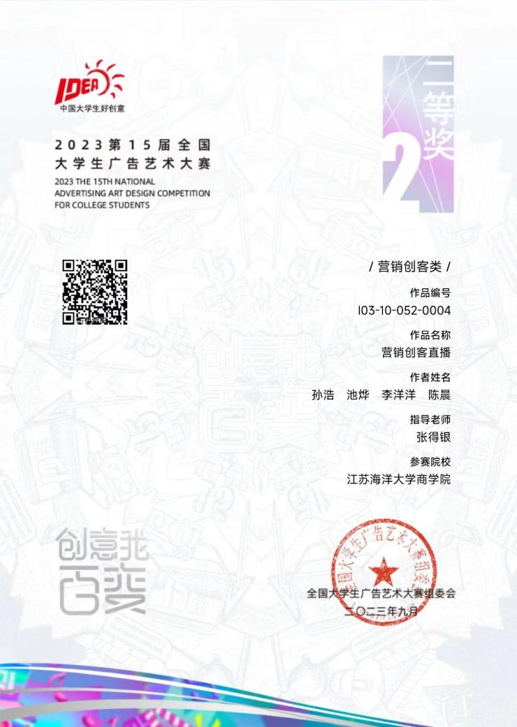 2023年由商学院组织,计算机工程学院、创新创业学院、艺术设计学院和应用技术学院组队参赛。艺术设计学院与商学院跨学院组队“镜花泠影”团队,获得全国总决赛一等奖、新加坡赛金质奖,另获国家级二等奖8项、三等奖11项、全国总决赛暨新加坡全球品牌策划赛最佳院校组织奖。