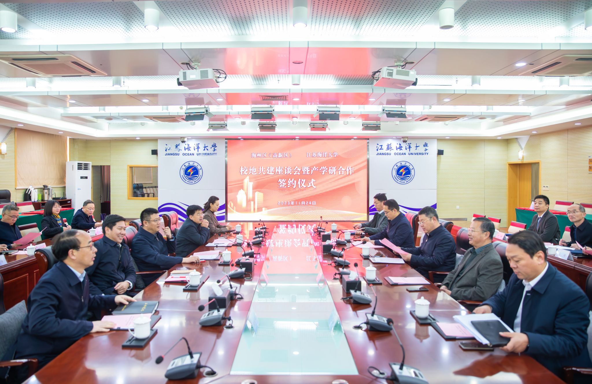 11月24日上午,我校与海州区(高新区)校地共建座谈会暨产学研合作签约仪式在会议中心东海厅举行。校党委书记许峰,校长宁晓明,海州区委书记、高新区党工委书记、管委会主任李锋,海州区委副书记、区政府代区长朱伟哲出席座谈会,双方围绕全面深化校地合作进行座谈交流,并签署合作协议。党委常委、副校长申欣主持会议。