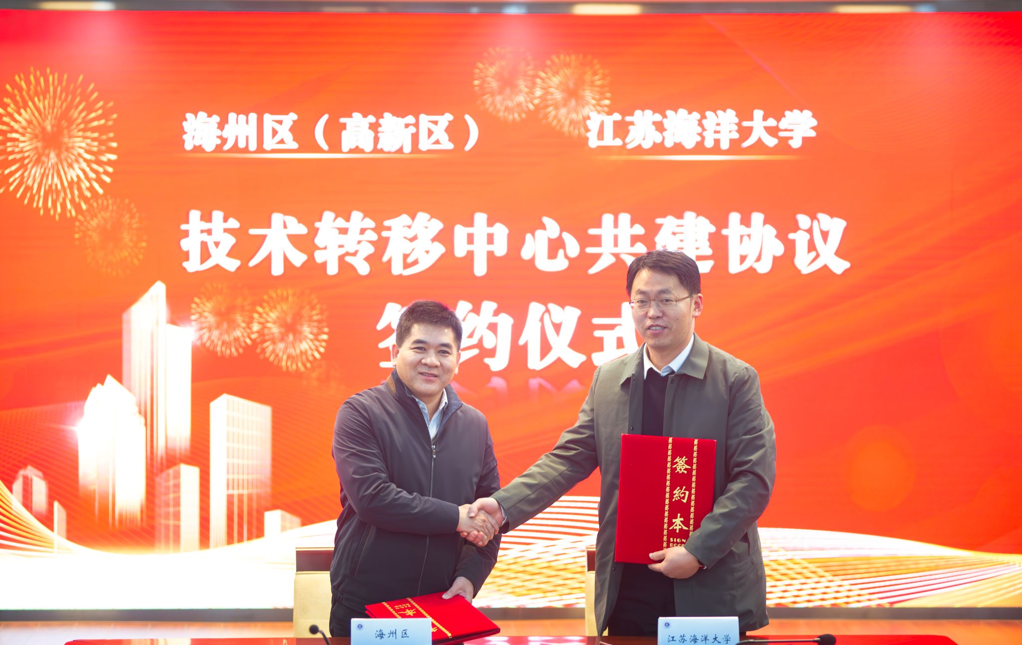 海州区市场监督管理局局长、知识产权局局长陈贤斌和我校戴红伟代表双方签订《海州区知识产权局―江苏海洋大学知识产权运营中心共建协议》。