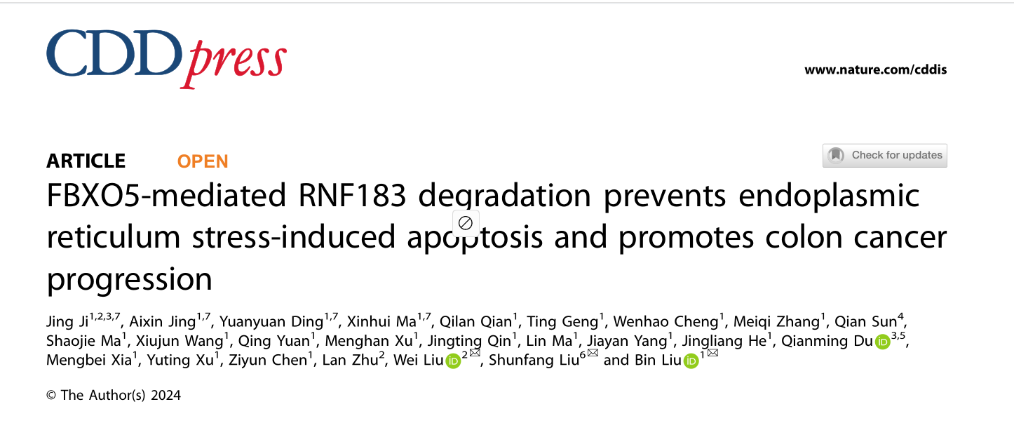1月12日,药学院刘彬&吉敬课题组团队以江苏海洋大学为论文第一完成单位和通讯单位在Nature(《自然》)旗下子刊Cell Death and Disease(IF=9, 中科院1区,TOP期刊)上发表了题为“FBXO5-mediated RNF183 degradation prevents endoplasmic reticulum stress-induced apoptosis and promotes colon cancer progression”的研究论文。通过多学科通力协作,该研究成果首次揭示了FBXO5在结肠癌发生发展中的重要性,详细阐明了FBXO5与内质网应激之间的关系,通过多种生物学技术深入研究了FBXO5在结肠癌中异常表达和发挥作用的具体分子机制,为结肠癌的诊断和治疗提供新的重要理论依据。该文第一作者是药学院的吉敬副教授,刘彬教授、刘伟教授为共同通讯作者。