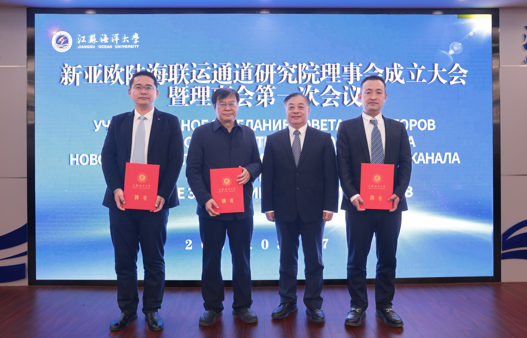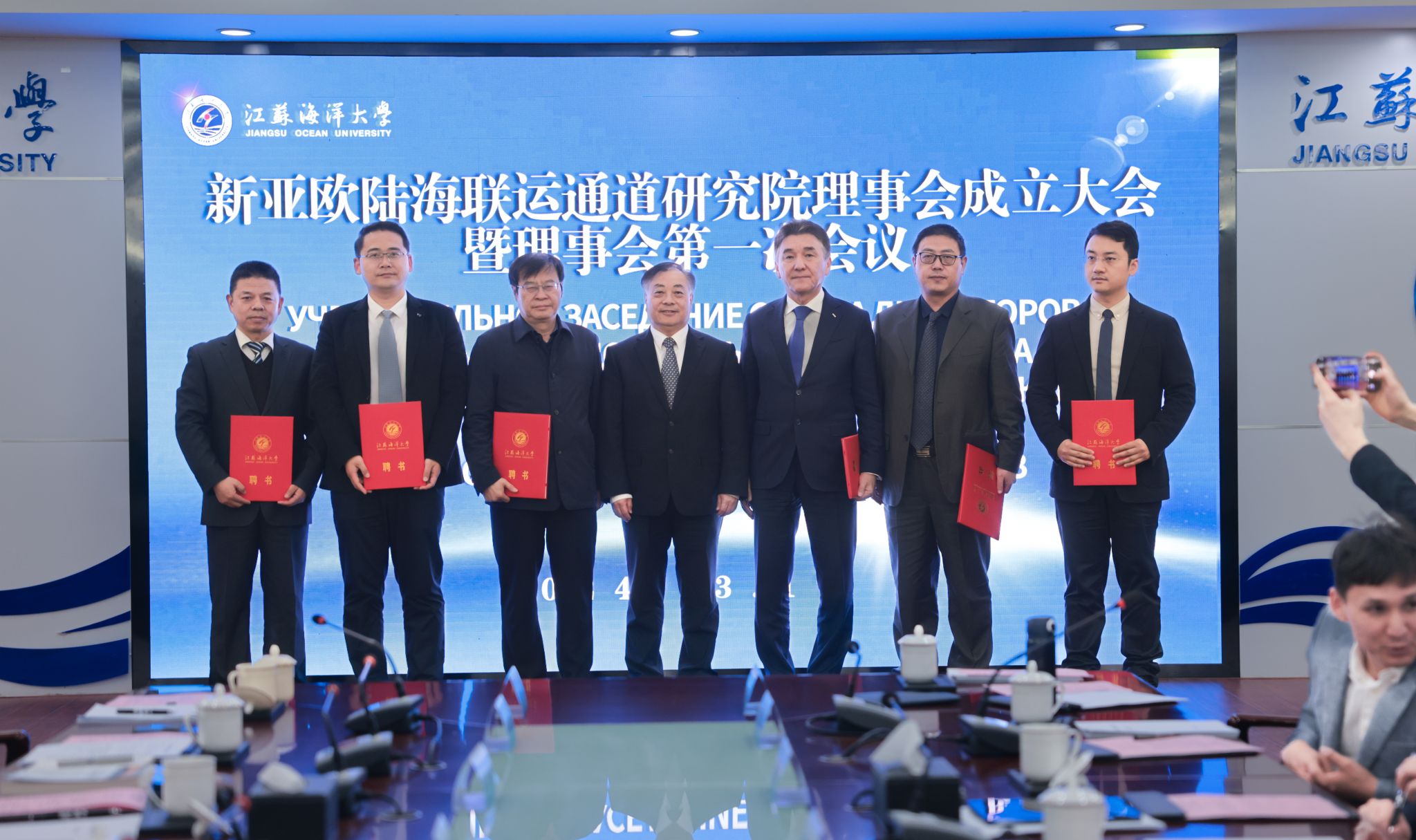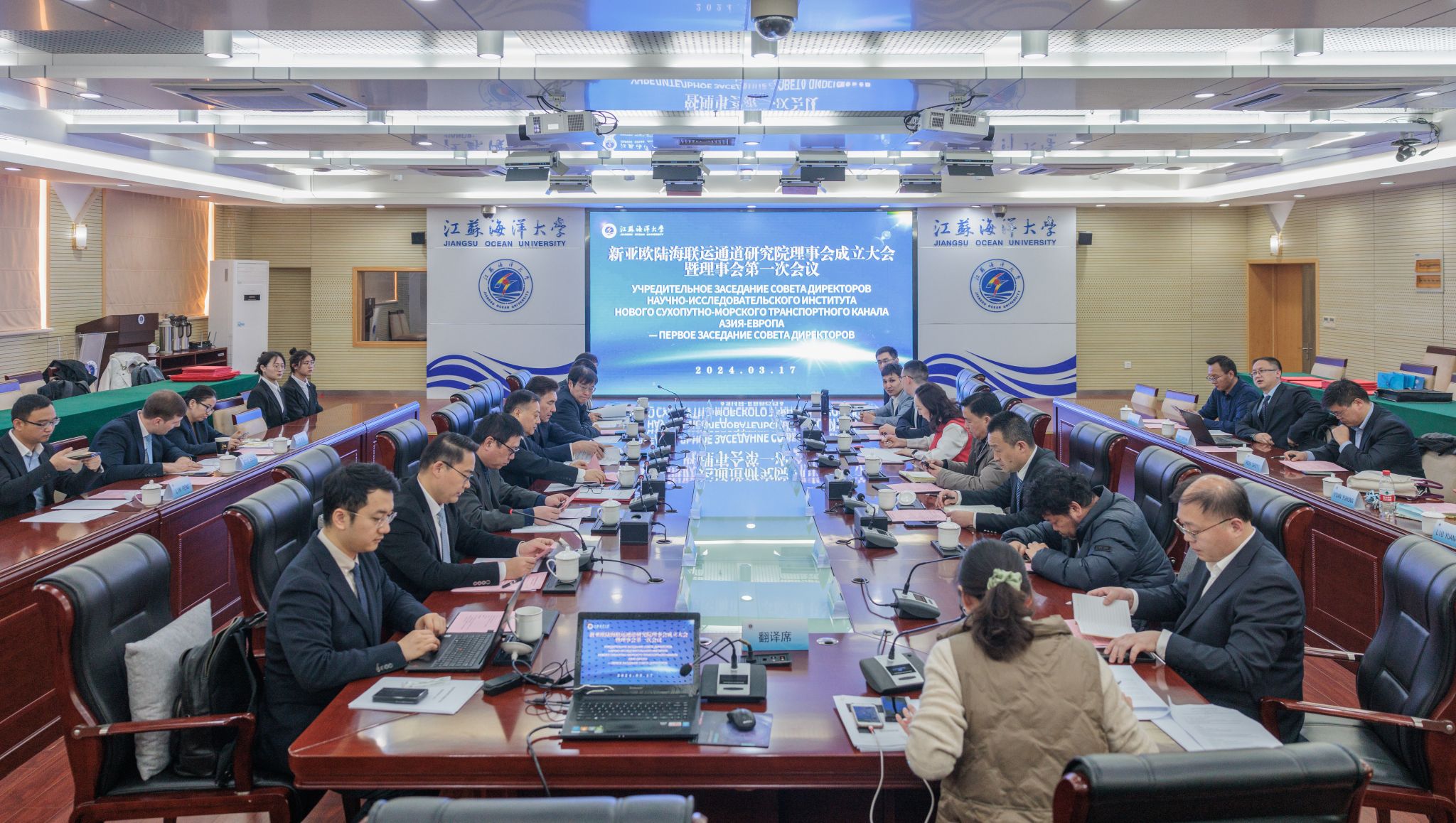 3月17日,新亚欧陆海联运通道研究院理事会成立大会暨第一次全体会议在我校会议中心东海厅召开。连云港市政协副主席、市发展与改革委员会主任韦怀余,阿斯塔纳国际大学校长伊尔萨利耶夫·谢里克,江苏海洋大学副校长申欣,清华大学“一带一路”战略研究院执行院长史志钦出席会议。申欣主持会议。