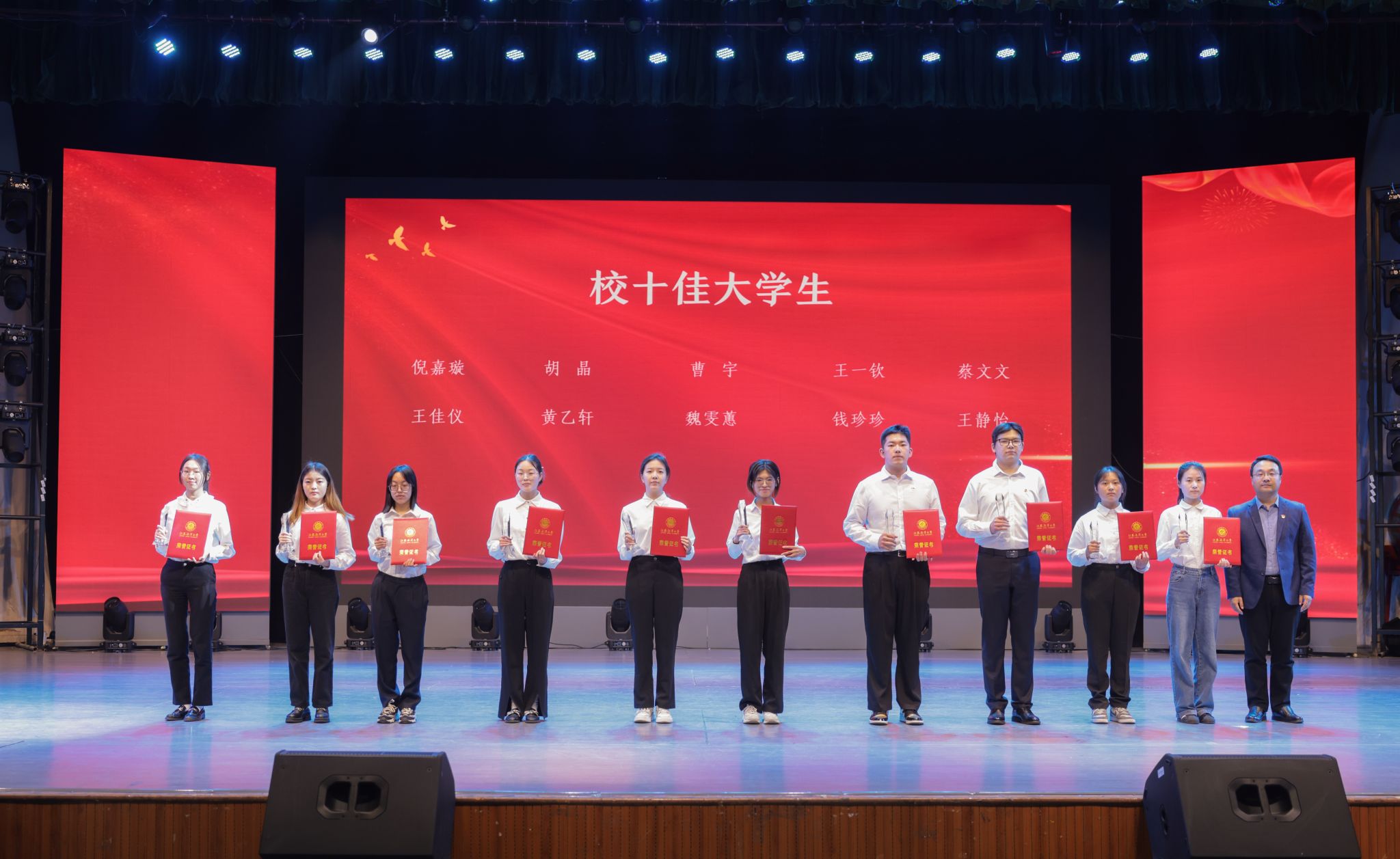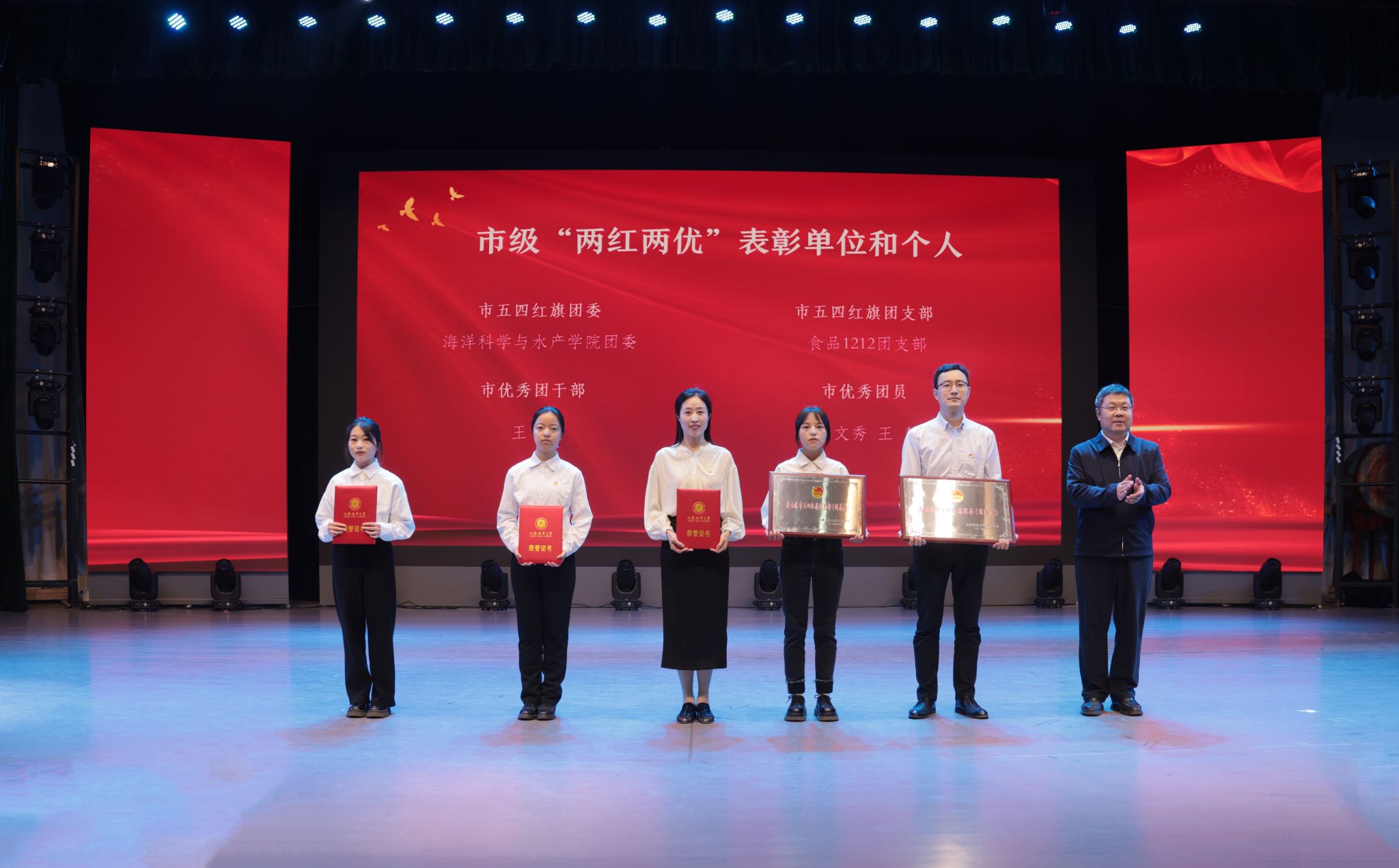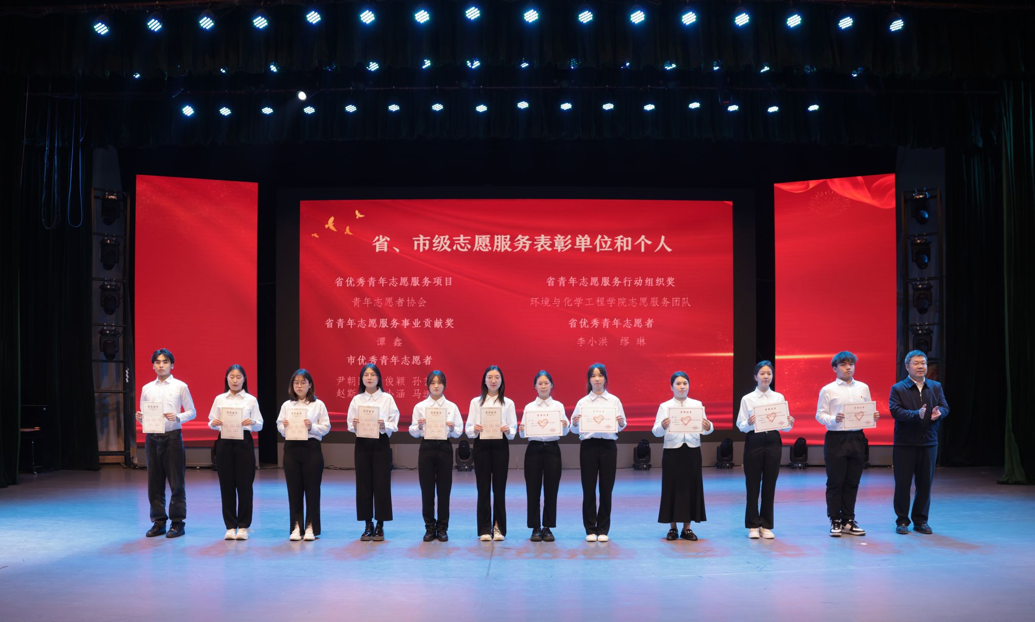 与会领导分别为获省、市级志愿服务表彰的先进集体代表与个人、市“两红两优”先进集体代表与个人、校五四红旗团委、校社会实践先进单位、校共青团先进工作者、校五四红旗团支部代表、校优秀团干部代表、校优秀团员代表、校最美志愿者及校十佳大学生颁发荣誉证书。