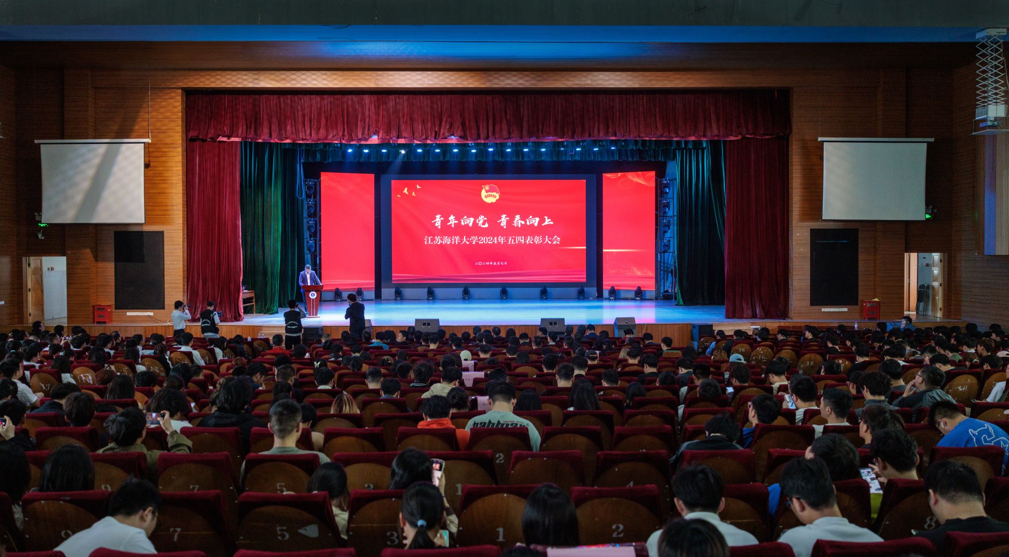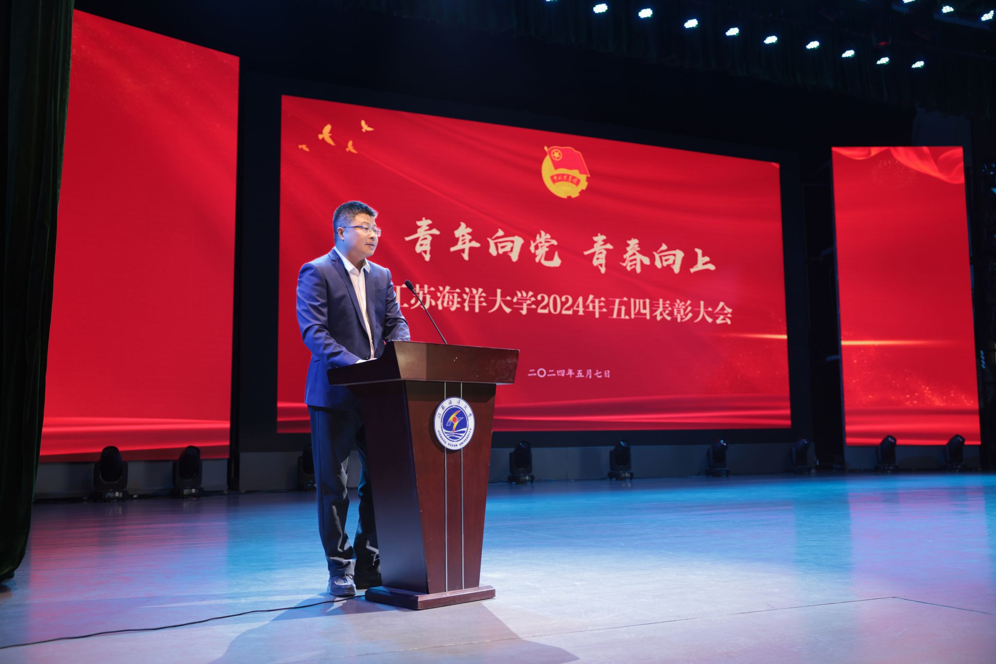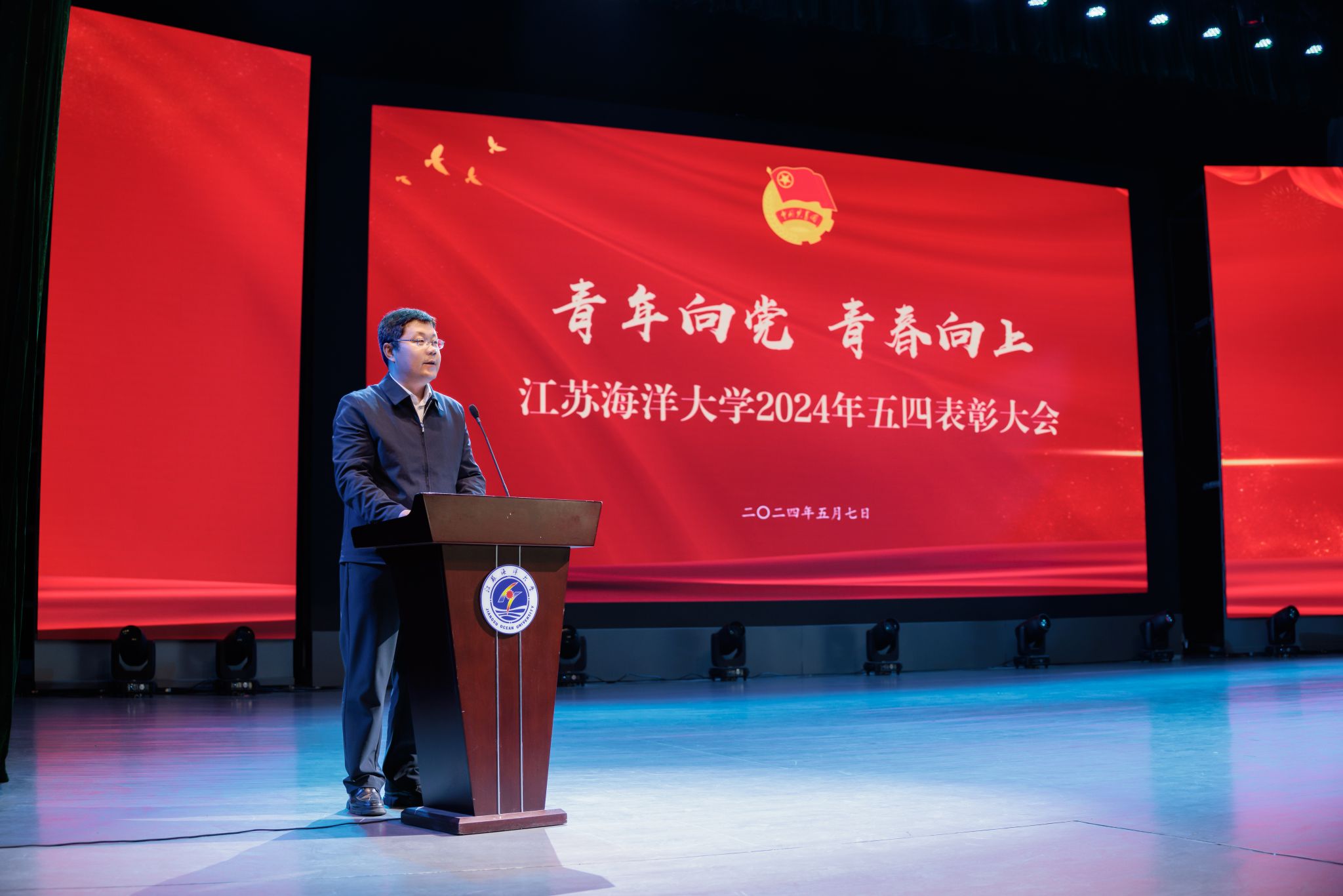 为纪念五四运动105周年,传承和弘扬“五四精神”,树立青年标杆,凝聚青年力量,5月7日下午,我校在苍梧校区大礼堂召开2024年五四表彰大会。校党委书记许峰、副校长朱国军出席大会。受省、市、校各级团组织表彰的集体和个人,以及600余名师生代表参加大会。大会由朱国军主持。