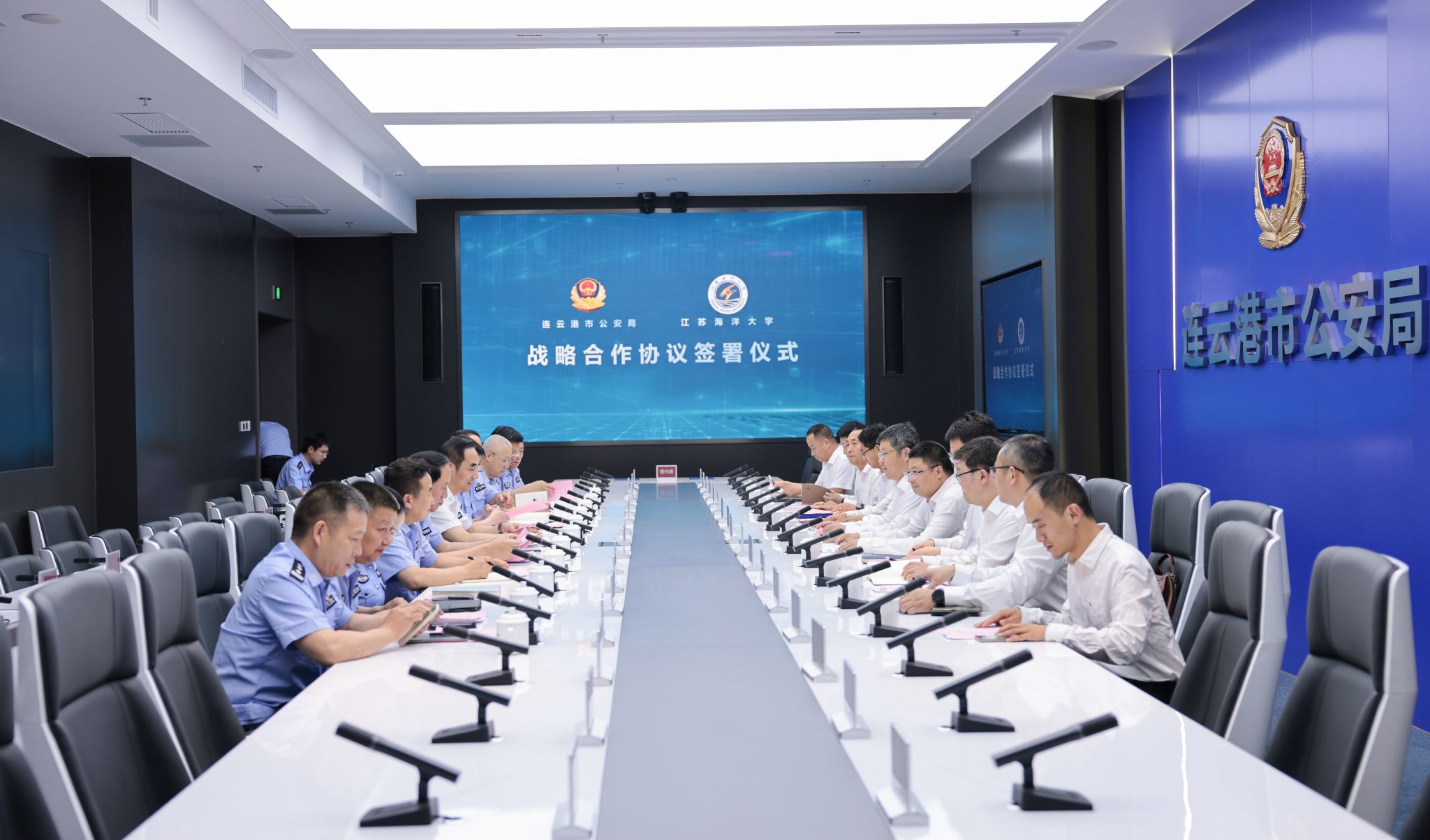 为进一步加强我校与连云港市公安局的合作,提升科学研究水平,创新人才培养模式,提高学校服务地方经济社会发展能力,7月4日,我校与连云港市公安局举办战略合作协议签约仪式。校党委书记许峰,连云港市副市长、市公安局局长、党委书记房庆忠,副校长朱国军,副校长郑利军出席签约仪式。