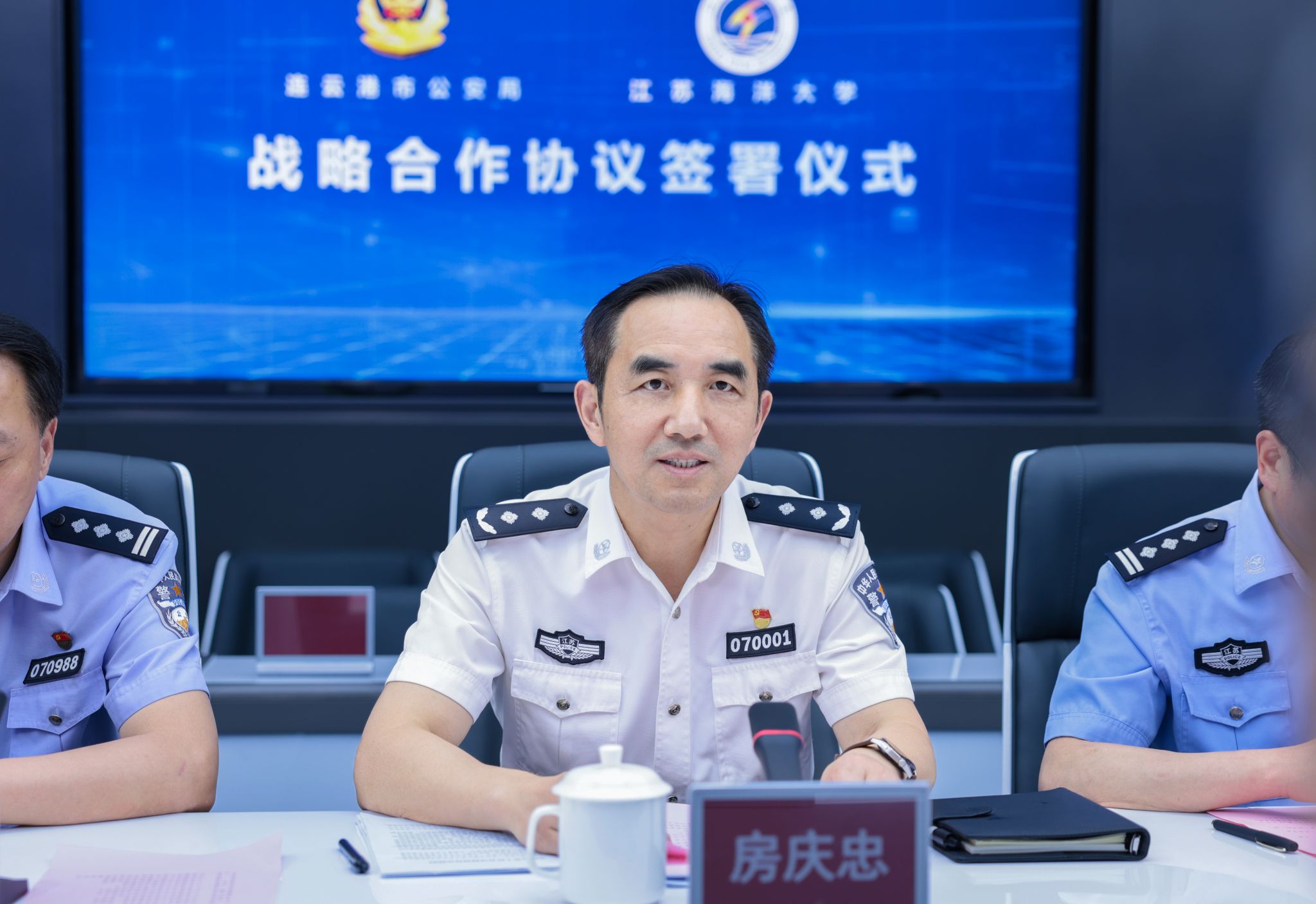 房庆忠表示,感谢学校长期以来对公安工作的大力支持,在全市科技兴警、公安事业创新发展的征程中,江苏海洋大学与公安机关长期保持友好合作。此次战略合作协议的签订,必将在更高起点、更深层次、更高水平上携手开启校警合作新篇章。他希望双方凝聚校警合作共识、加强协同联动,聚焦警务实战和培育人才,推动形成在科学研究、平台建设等多方面的校警深度合作新模式,不断提升警校合作新成效,共同为推动连云港市经济社会发展作出新的更大贡献。