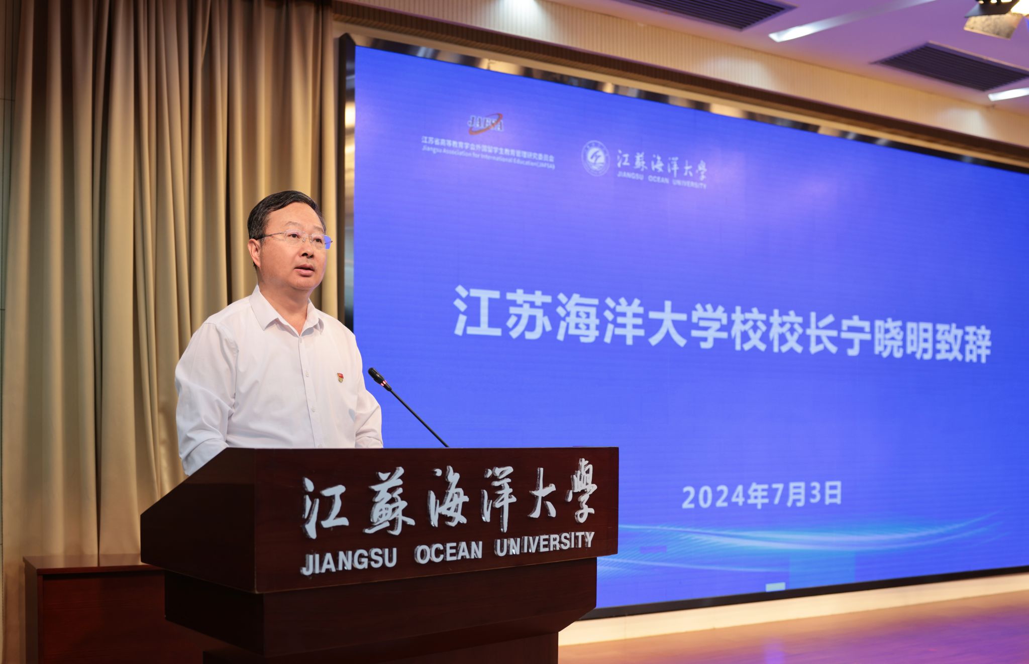 宁晓明对参加开班仪式的各位领导以及参加培训的全体授课专家和学员表示热烈欢迎,并从办学历史、学科专业、人才培养、科学研究、国际交流合作以及学校近期取得的系列办学成果等方面介绍了学校“向海”发展情况。宁晓明希望各兄弟院校奋战在留管工作一线的同志学有所获,彼此加强交流,互相分享留管工作的宝贵经验,找问题、补短板,共同助力江苏省来华留学教育事业高质量发展。