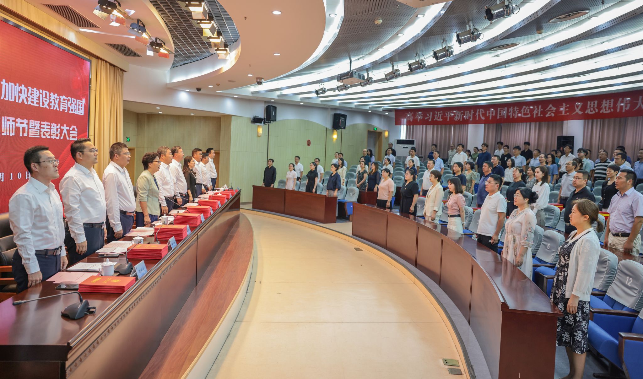 许峰以《大力弘扬教育家精神 做躬耕教坛的‘大国良师’》为题发表讲话。他介绍了我校教师队伍建设取得的成效,用“十个进位”回顾了一年来学校在一流应用型本科高校建设、提升人才培养质量、推进学科科研、加强基层党建等方面取得的成绩。