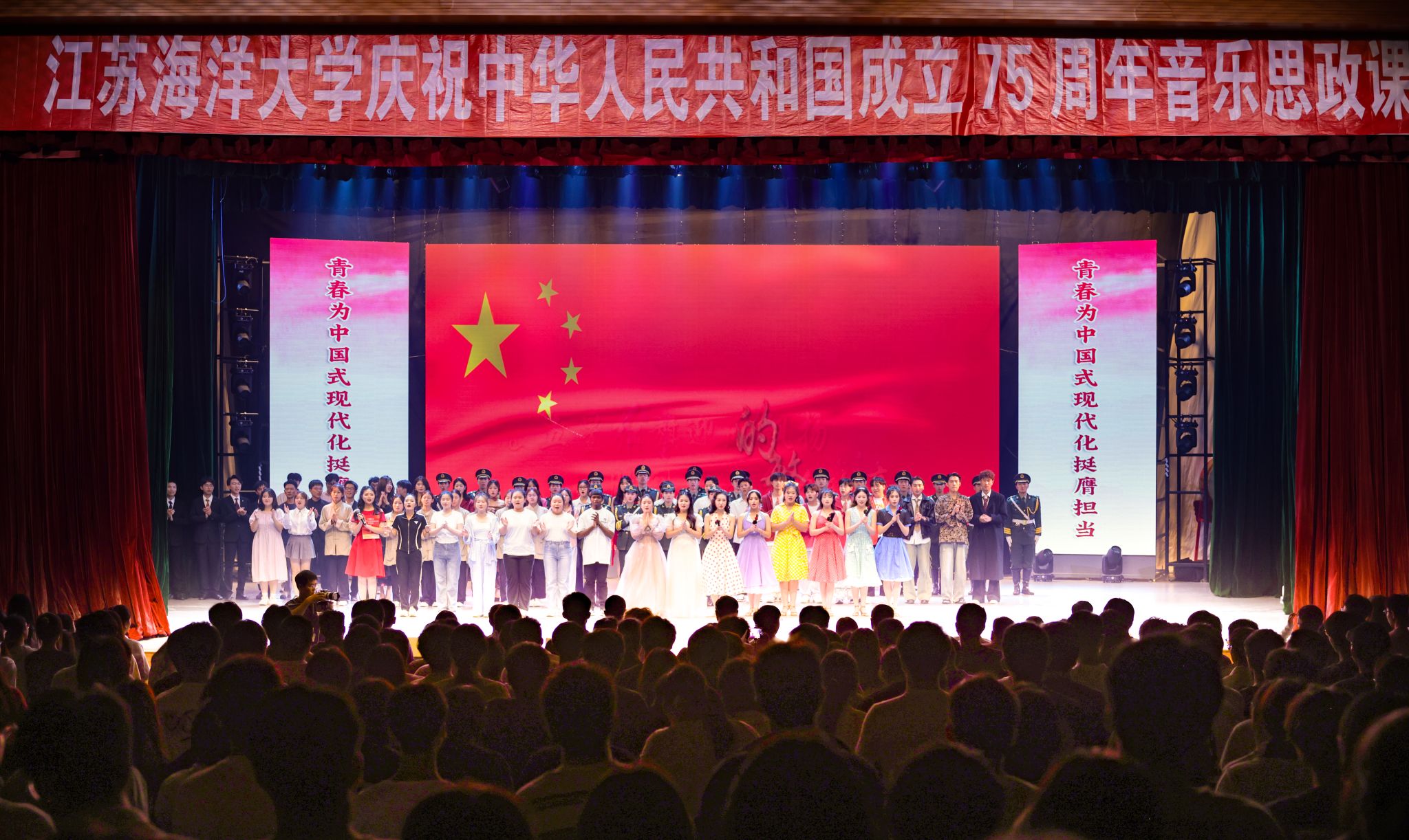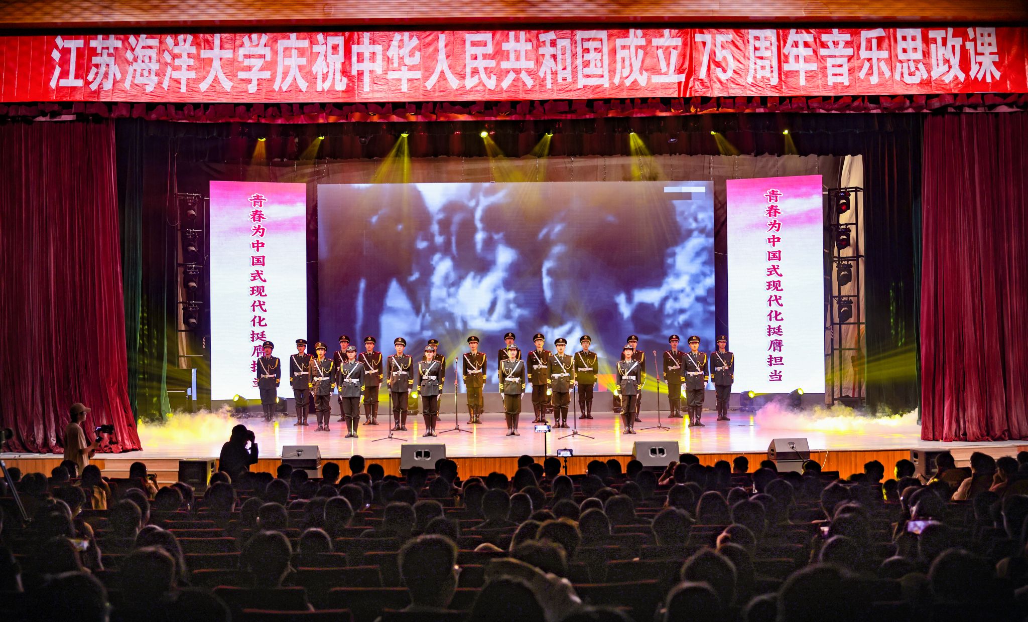 七十五载砥砺奋进,激扬青春谱写华章。9月27日晚,江苏海洋大学“庆祝中华人民共和国成立75周年音乐思政课”在苍梧校区大礼堂举行。校党委书记许峰,副校长金芙蓉、朱国军,相关部门、学院负责人,以及1400余名师生齐聚现场,同上一堂音乐思政大课,聆听经典名曲,一起感受文化艺术魅力与深厚家国情怀的交融碰撞。本次思政课以线下观看与线上直播相结合的方式进行。
