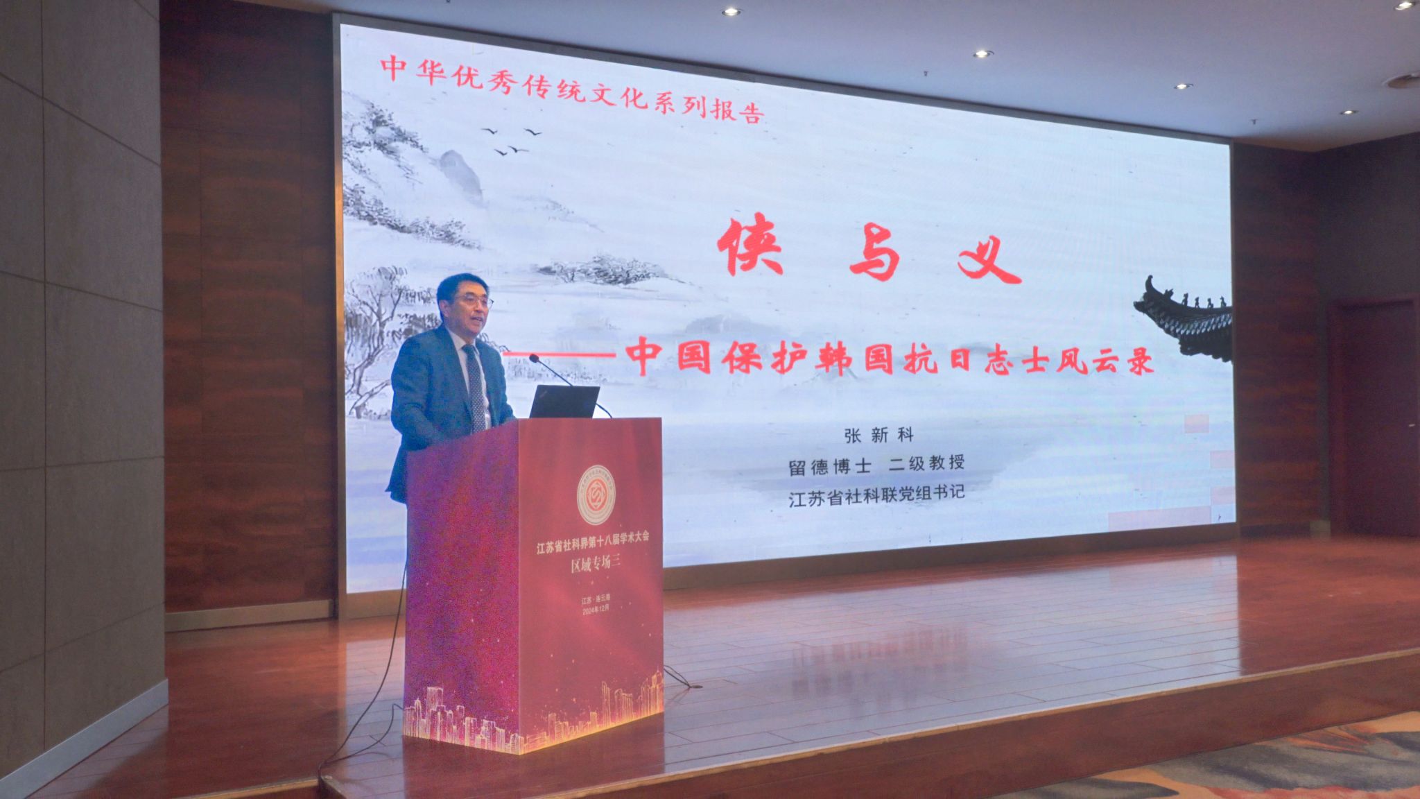 省社科联党组书记张新科作题为《侠与义——中国保护韩国抗日志士风云录》的学术报告。他用大量的真实图片和生动的故事揭密了抗战期间中国人民保护在华韩国临时政府人员的史海钩沉,再现了中韩两国携手抗击侵略的动人篇章。张新科指出,中国人民保护金九等韩国抗日志士的真实历史,对于启示当下如何以史为鉴,在未来的路上走得更稳、更远,具有重要意义。