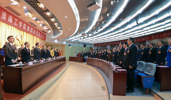 12月21日上午,在庄严的国歌声中,中国共产党淮海工学院第四次代表大会在会议中心黄海厅隆重开幕。会场正前方悬挂着“中国共产党淮海工学院第四次代表大会”的红色条幅,十面鲜艳的党旗分列主席台两侧,正中簇拥着的党徽闪耀着金色光芒。会场后方,“高举习近平新时代中国特色社会主义思想伟大旗帜,聚焦立德树人,聚力高质发展,为建设高水平应用研究型海洋大学而努力奋斗”的横幅格外醒目。