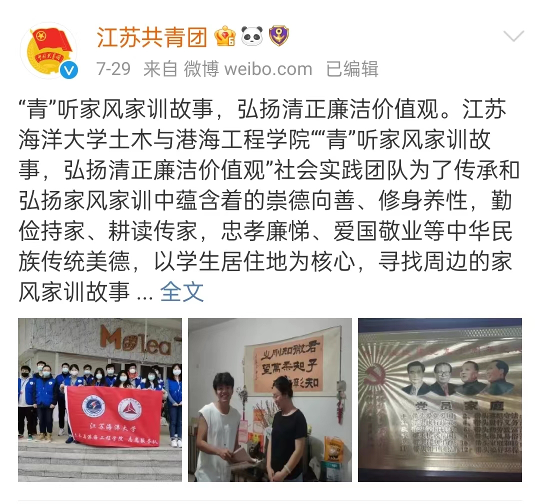 土木与港海工程学院党委举办的“‘青’听家风家训故事 弘扬清正廉洁价值观”活动受到江苏共青团微博报道