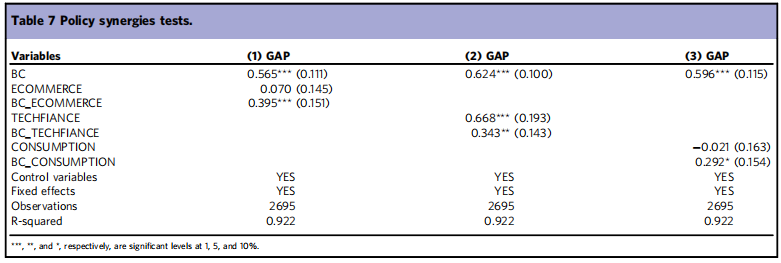 考虑到单个政策施行往往伴随着其他政策的协同效应,论文合作者们进一步构建了协同效应模型,并对多个政策的综合影响进行了计量分析。其中,在计量模型中主要引入了国家电子商务示范城市政策、国家信息消费试点城市政策、促进科技和金融结合试点政策。结果表明,上述政策可以与宽带中国政策产生协同效应并减缓收入差距扩大的趋势。