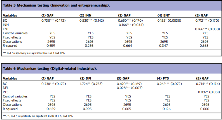 为检验“宽带中国”政策对城乡收入差距的影响机制,论文合作者们进一步构建逐步回归模型检验中介效应,创新性的发现该政策通过作用于创新、创业和数字相关产业发展影响收入分配。这一发现拓宽了研究机理,并为后续研究提供了分析框架。
