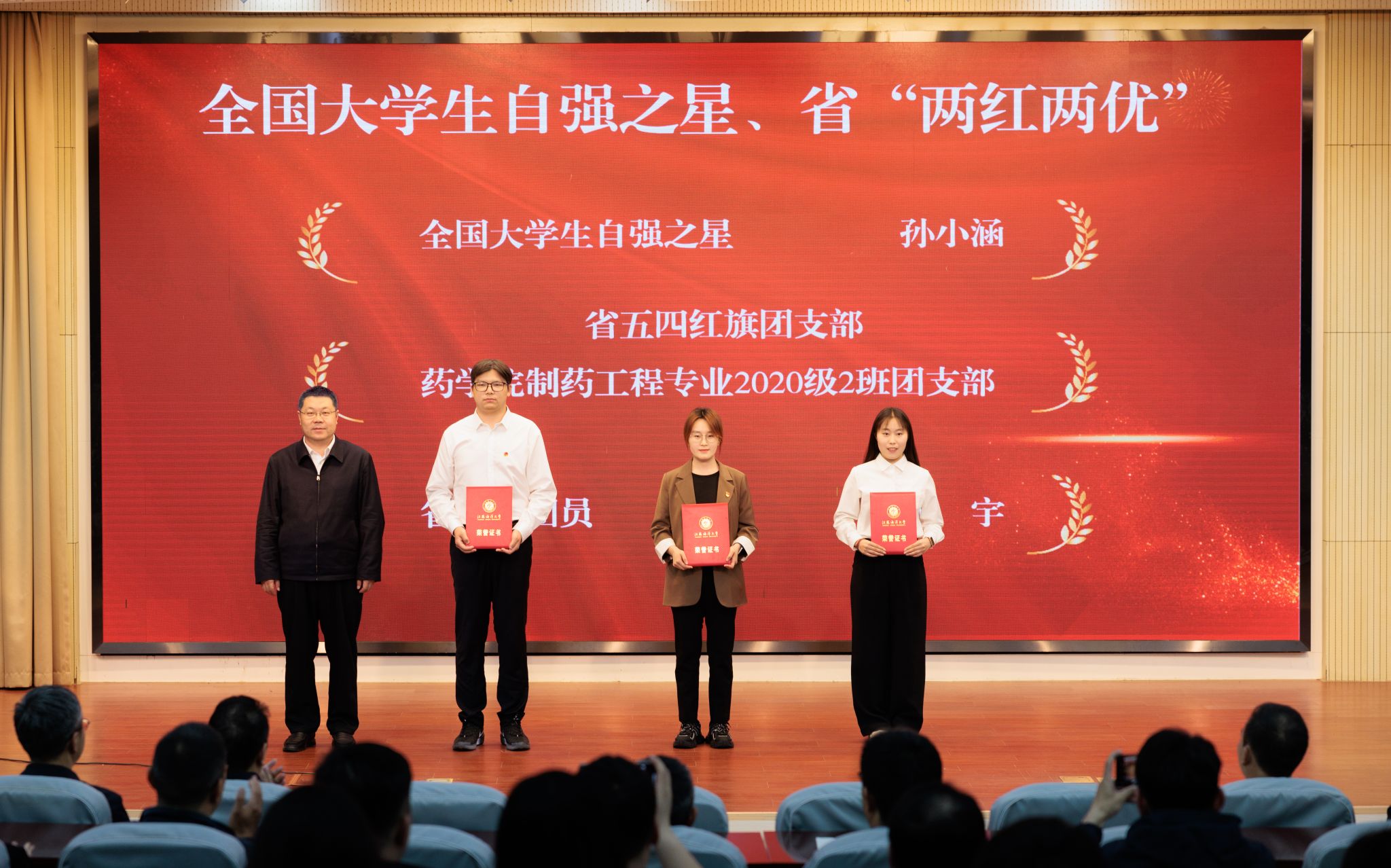 会议表彰了全国大学生自强之星、江苏省“两红两优”、校五四红旗团委、校共青团先进工作者、校志愿服务先进集体及个人、校思政比武优秀指导教师、“我最喜爱的老师”、校十佳志愿者、校五四红旗团支部代表、校优秀共青团干部代表、校优秀共青团员代表。与会领导向获奖者颁发了荣誉证书。