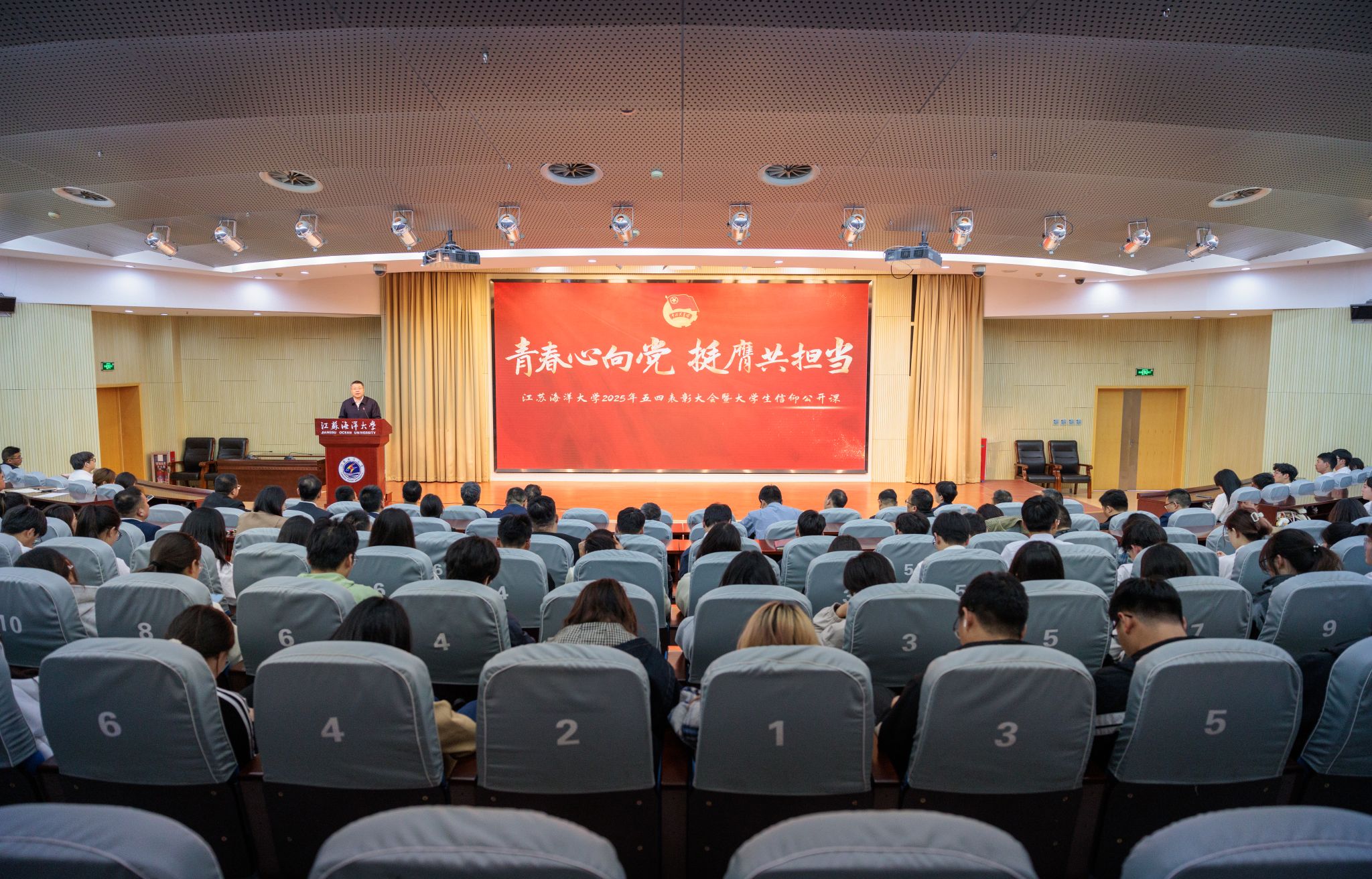 为继承和发扬五四精神,激励团员和青年坚定理想信念,激扬青春力量,近日,我校在黄海厅召开2025年五四表彰大会暨大学生信仰公开课。校党委书记许峰出席大会并讲话。副校长郑利军主持大会。受国家、省、校各级团组织表彰的集体和个人参加大会。