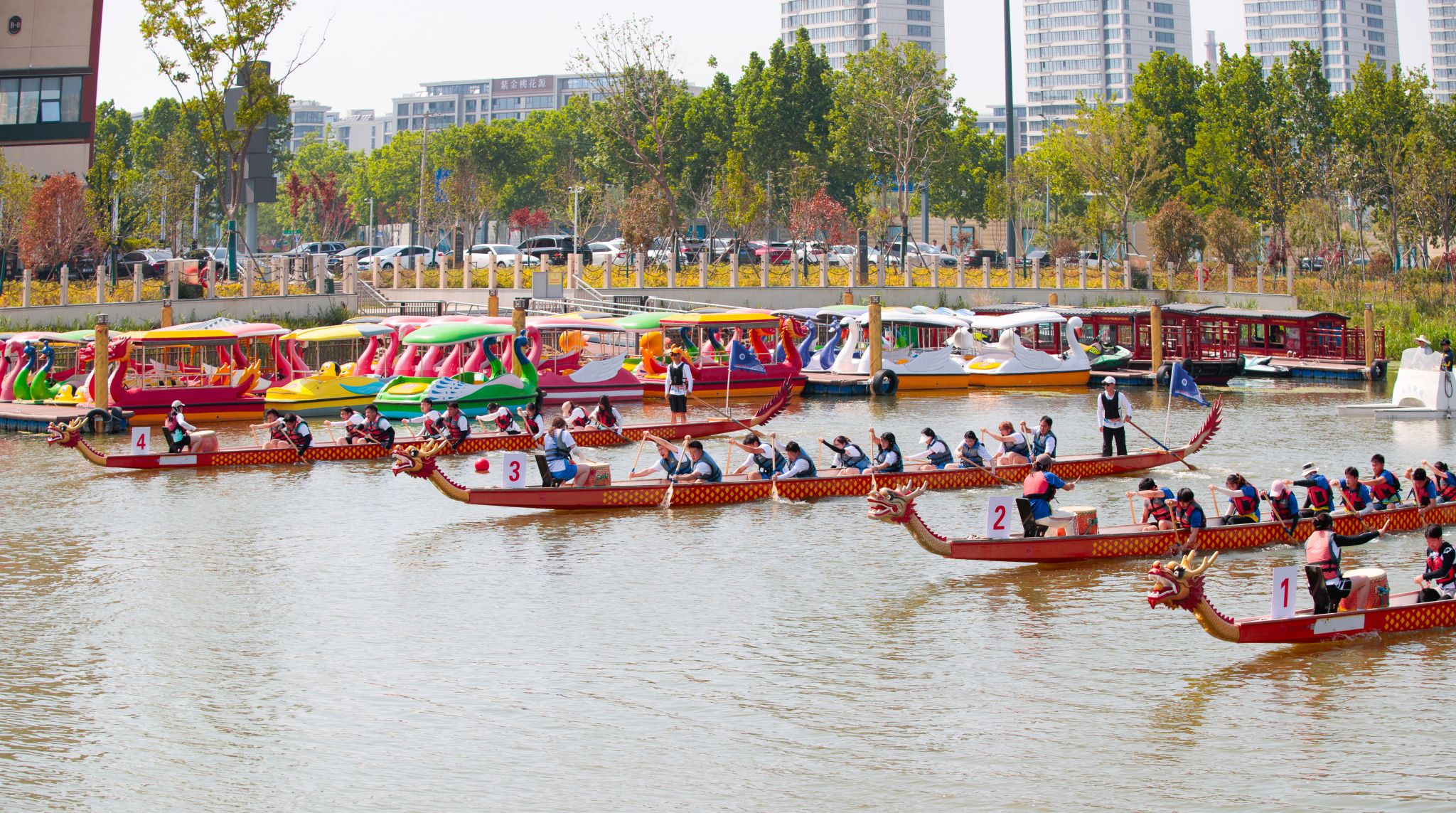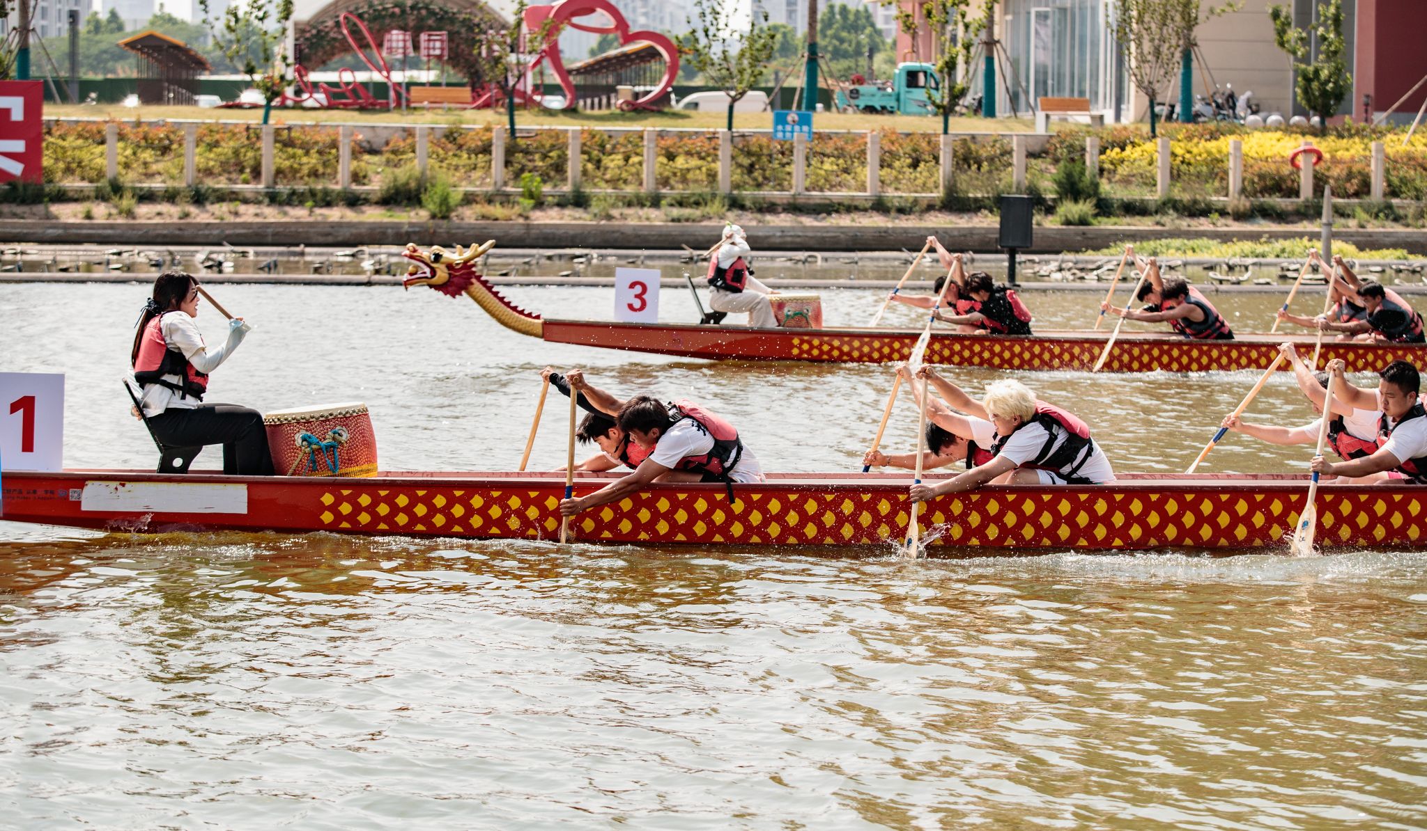比赛现场,运动健儿们热血沸腾、斗志昂扬、蓄势待发,当发令枪响彻云霄的刹那,数十艘龙舟似蛟龙入海般跃出起跑线,破浪疾驰。战鼓轰鸣,木桨起落如飞。运动健儿齐声呐喊,齐力挥桨,肌肉绷紧如弓弦,船艏破开碧波在江面犁出雪白航迹。龙舟竞渡处浪花击空,船与船的间距在浪涛间时缩时展,你追我赶的激烈角逐让空气都凝滞紧绷。两岸观众挥舞彩旗、振臂呐喊,鼓声、号子声此起彼伏,场面十分热烈。
