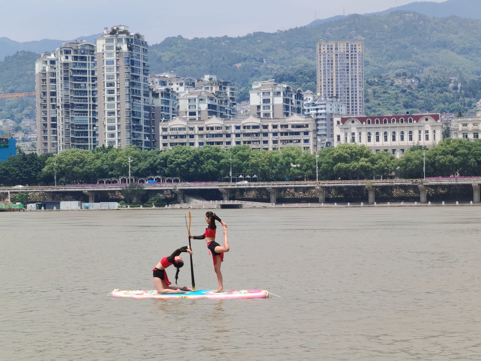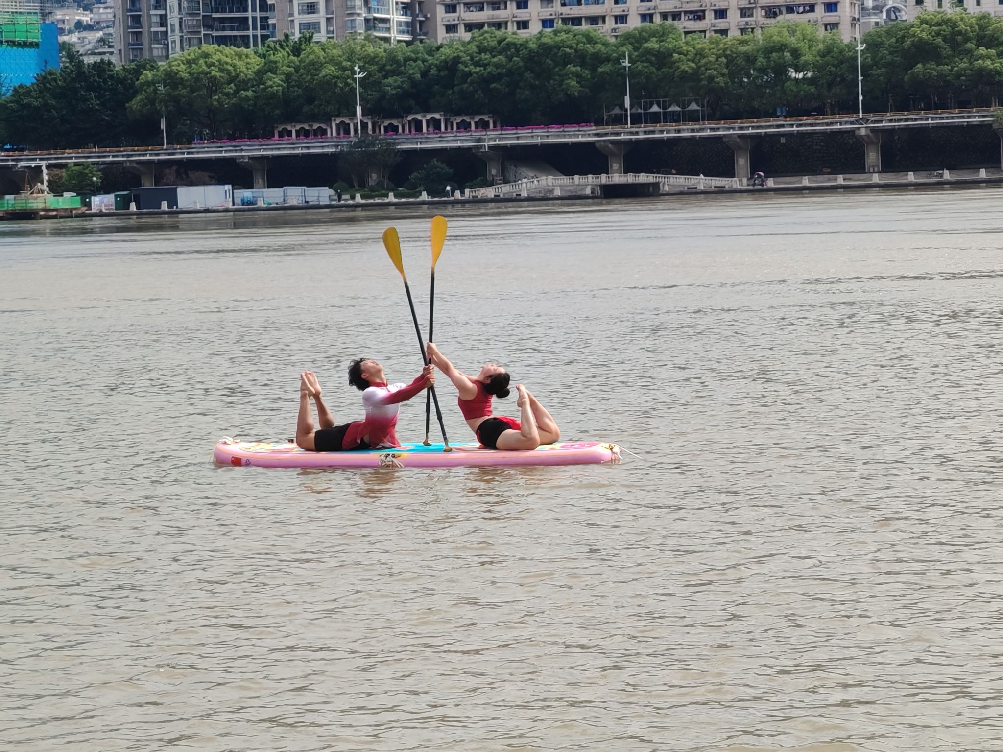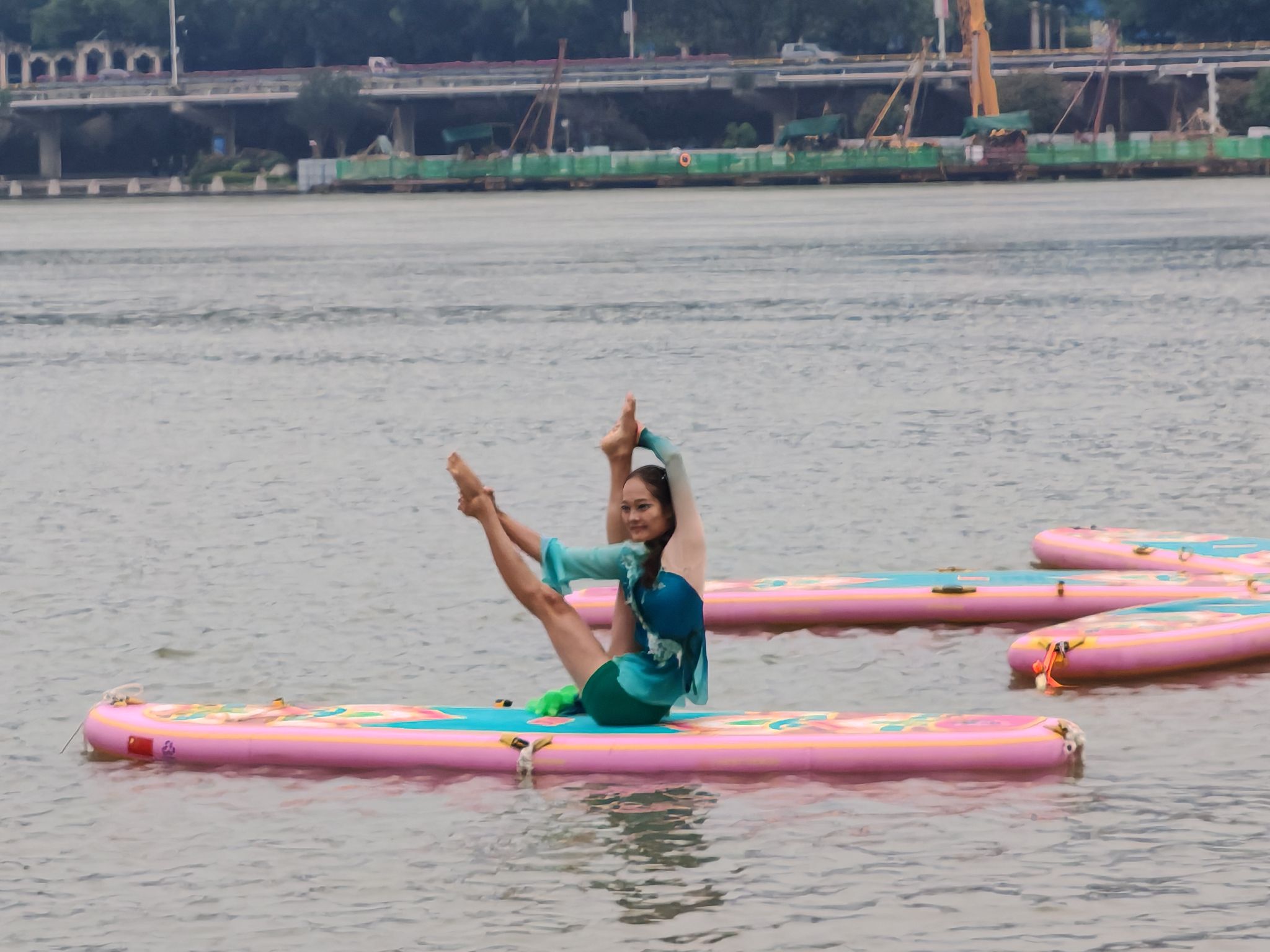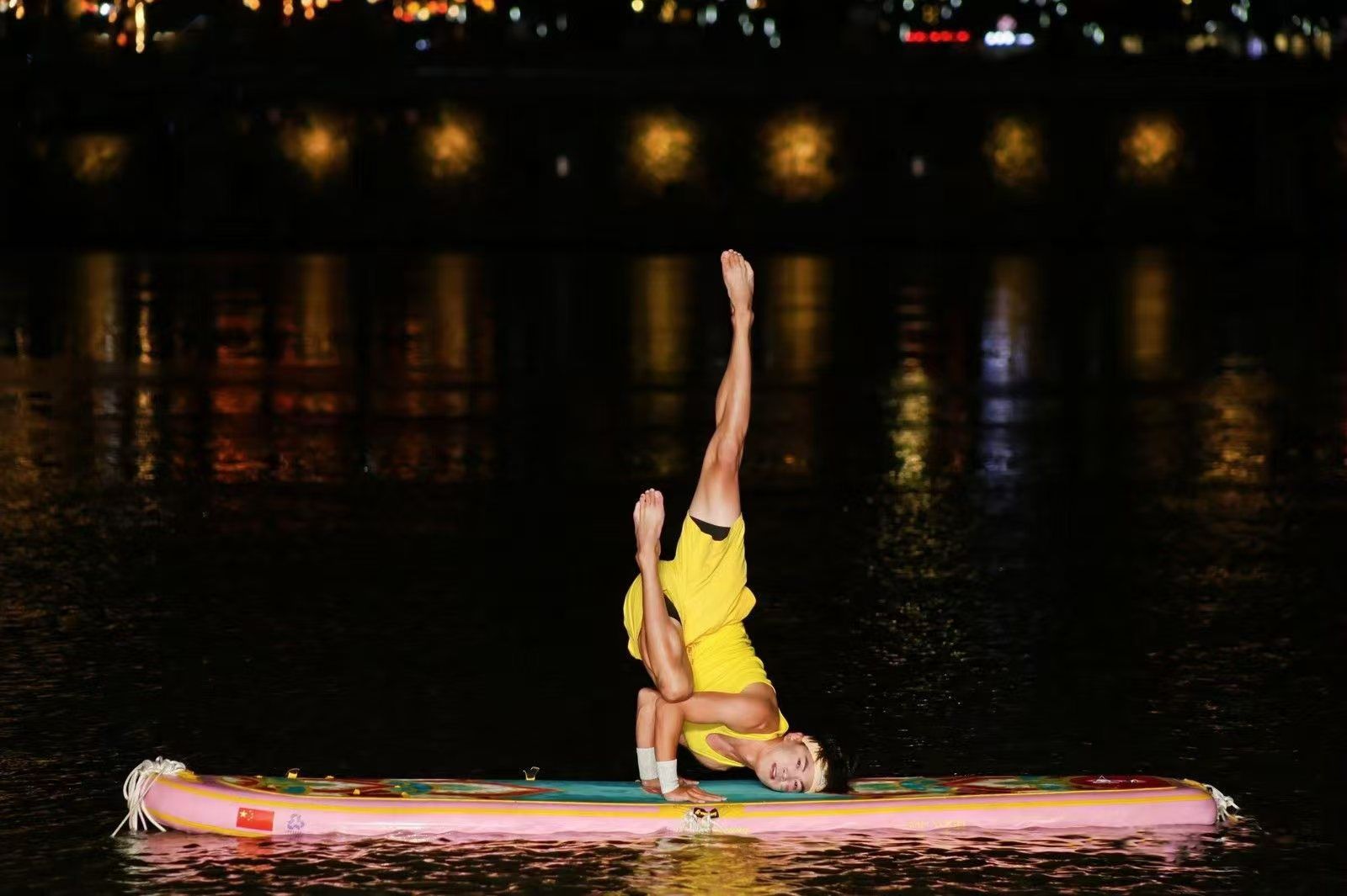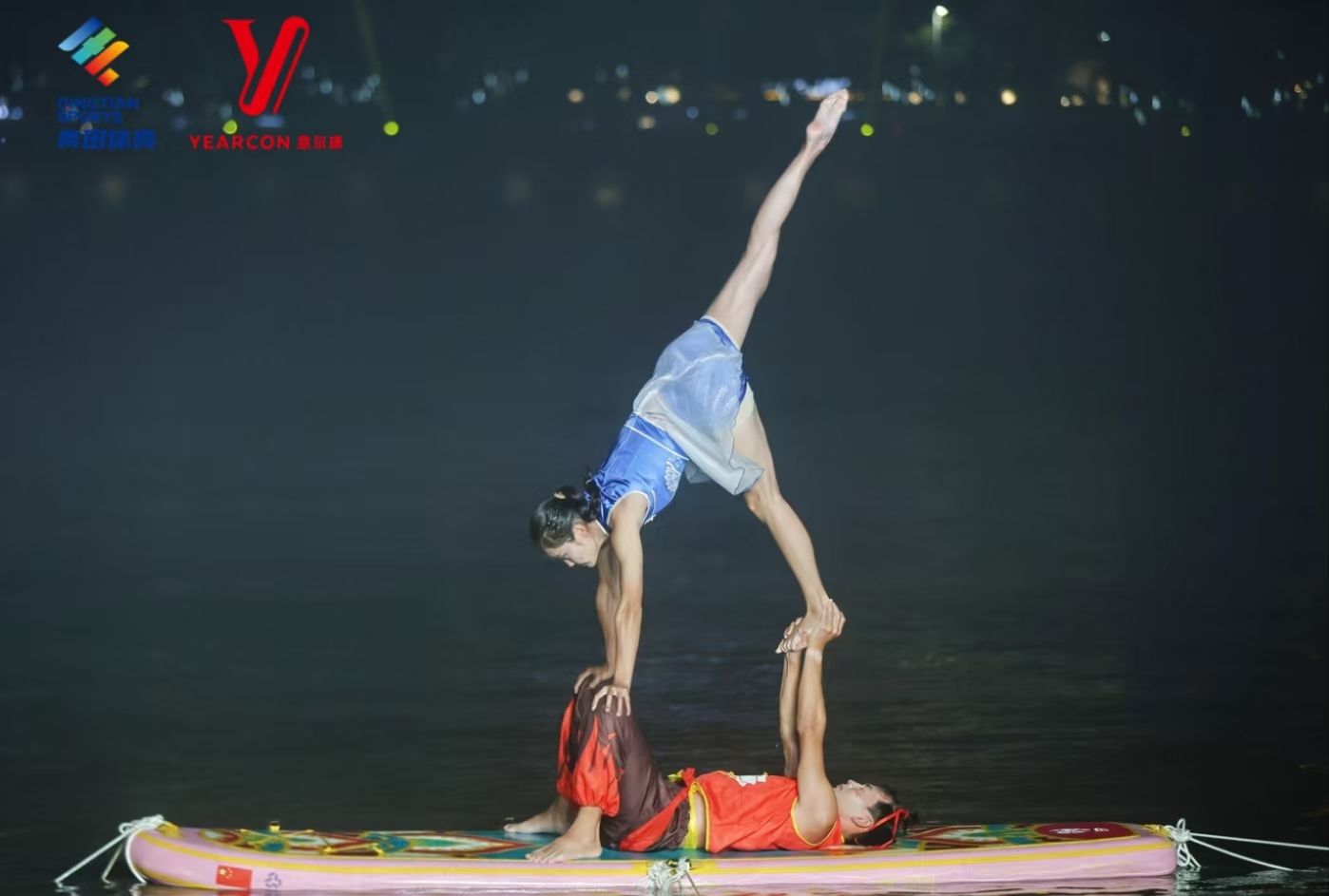 比赛中,我校桨板瑜伽队凭借扎实的技术水平展示及精彩的动作编排,充分展现出了精湛的竞技水平及体育风采。夜晚的太鹤湖云雾缭绕,队员们克服了风雨天气的影响,在桨板上做出倒立、劈叉、起腿等一个个高难度瑜伽动作,尽情展示力与美。