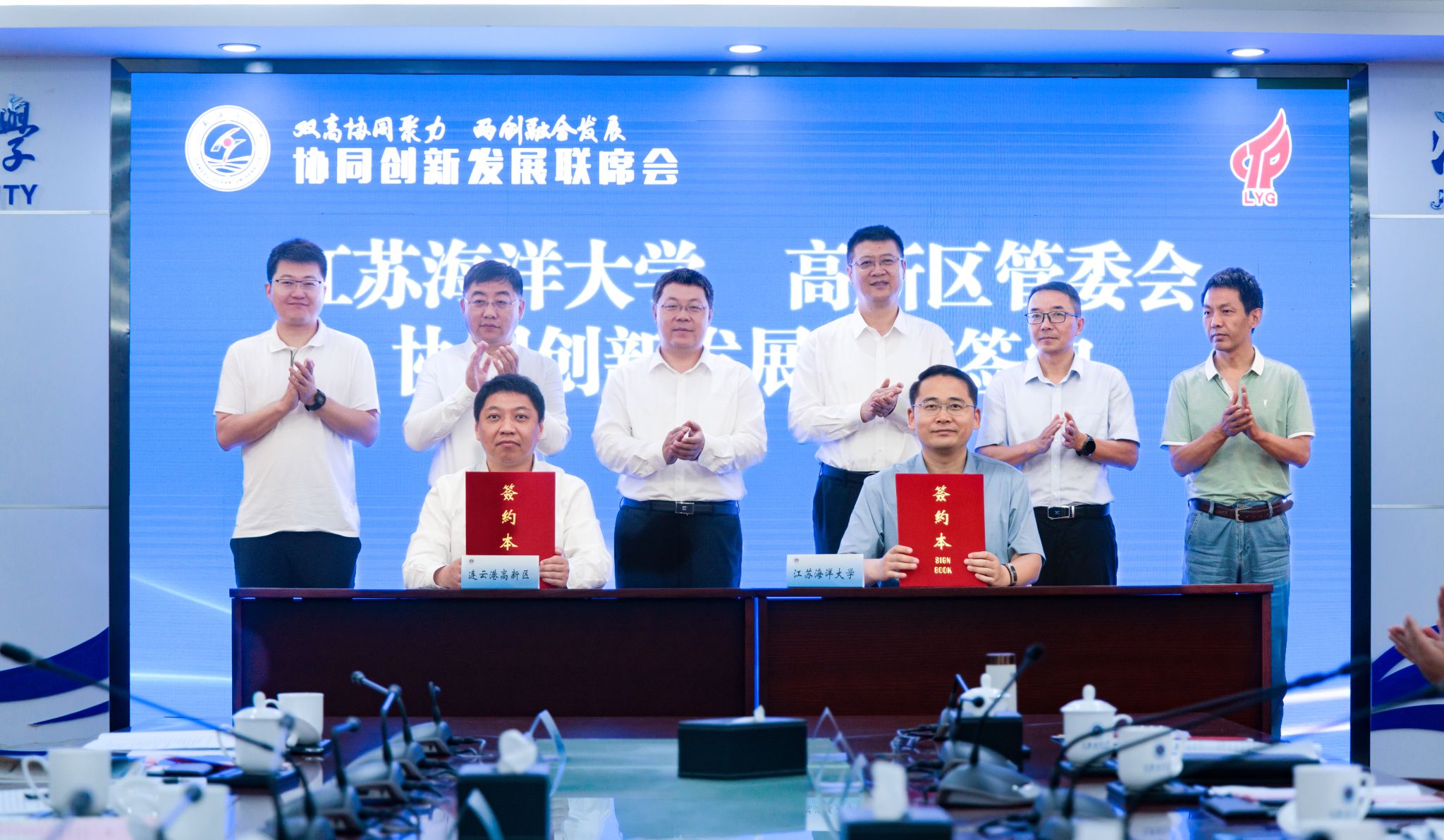 江苏海洋大学党委常委、副校长申欣,海州区委常委、高新区党工委副书记、管委会副主任宋志文代表双方签署协同创新发展合作协议。