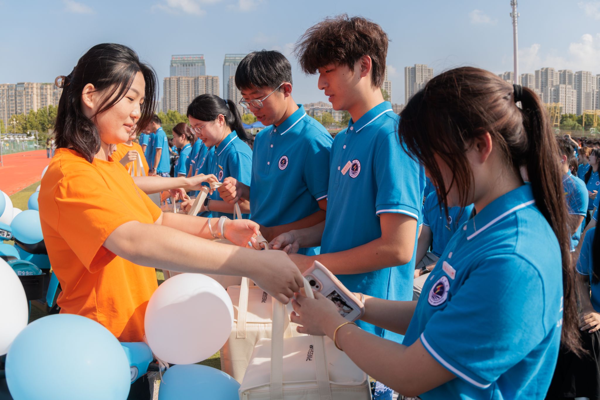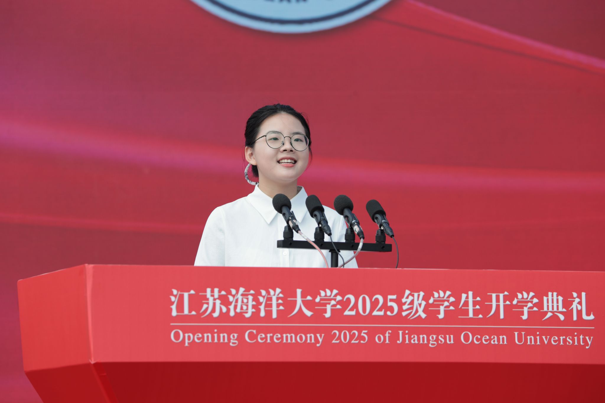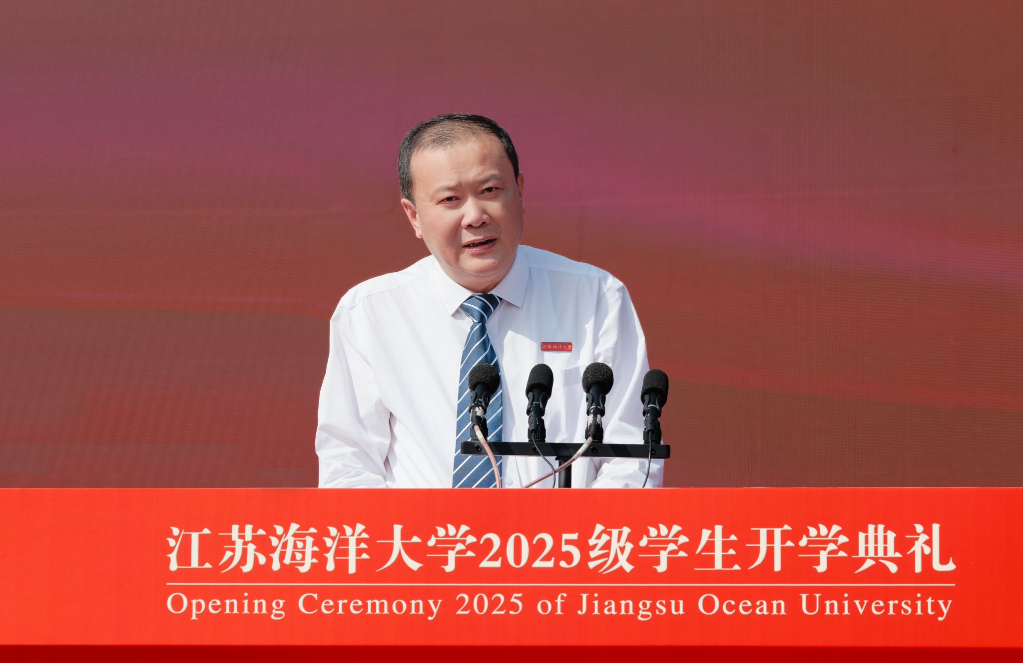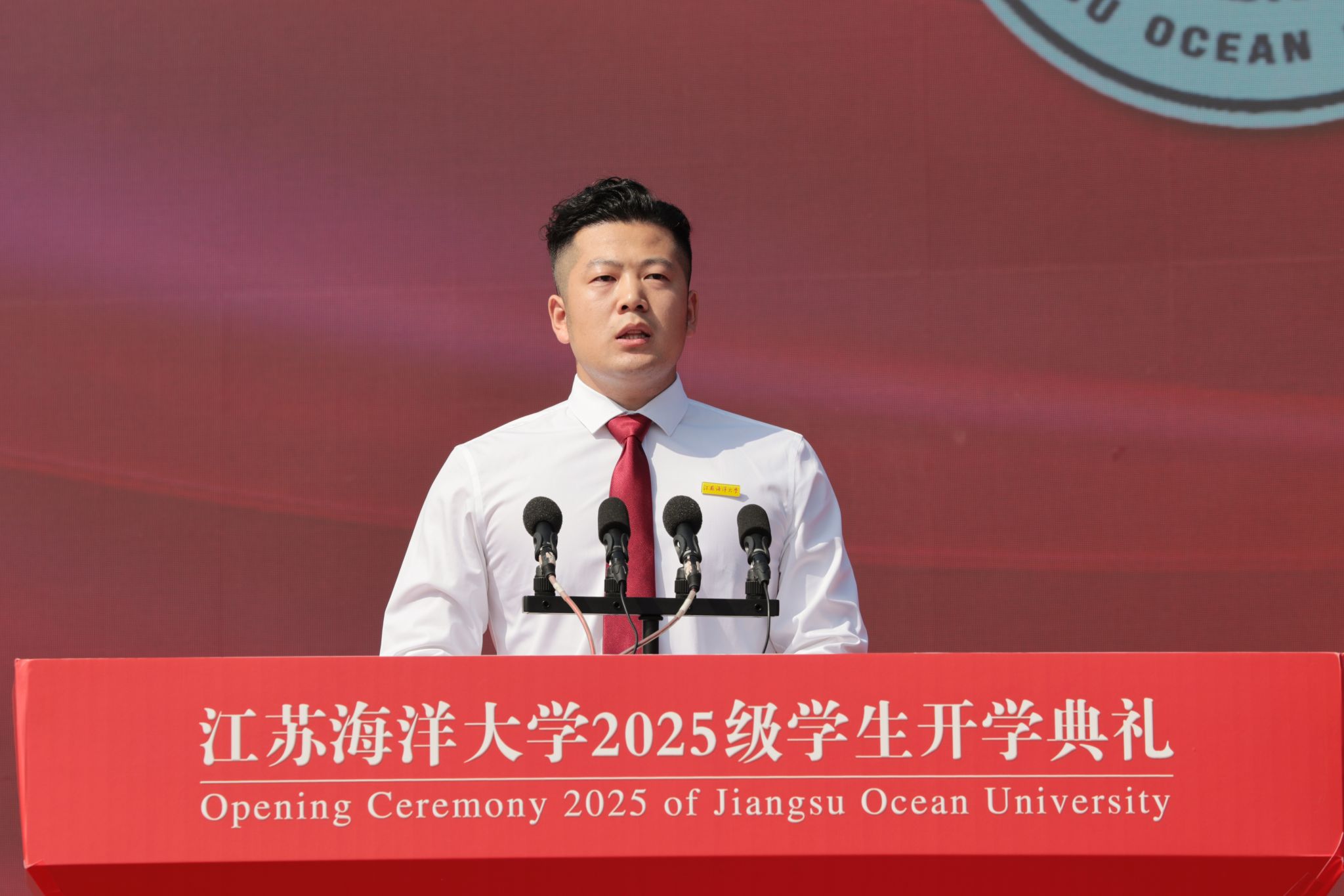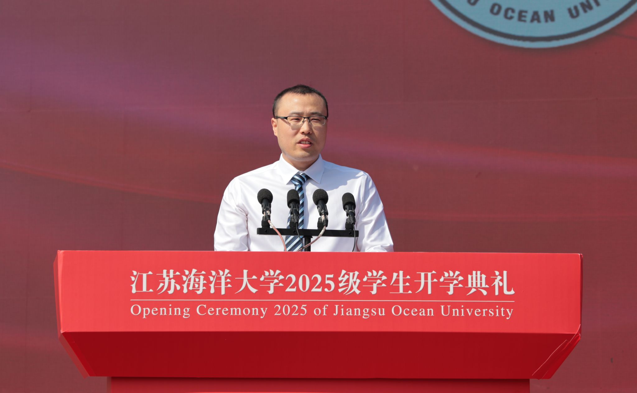 在庄重而热烈的气氛中,一项具有象征意义的仪式举行。校党委书记许峰为新生代表佩戴上江苏海洋大学校徽。所有新生同时将熠熠生辉的校徽郑重地别于胸前,不仅标志着他们正式成为“江海大”人,更象征着一份厚重的使命与精神的传承。他们成为海大奔涌向前的新鲜力量,他们将个人成长融入时代发展的壮阔洪流之中,坚定理想信念,锤炼过硬本领,以青春之奋斗诠释向海图强、强国有我的使命担当,在实现民族复兴的宏伟征程中绽放独特光彩。