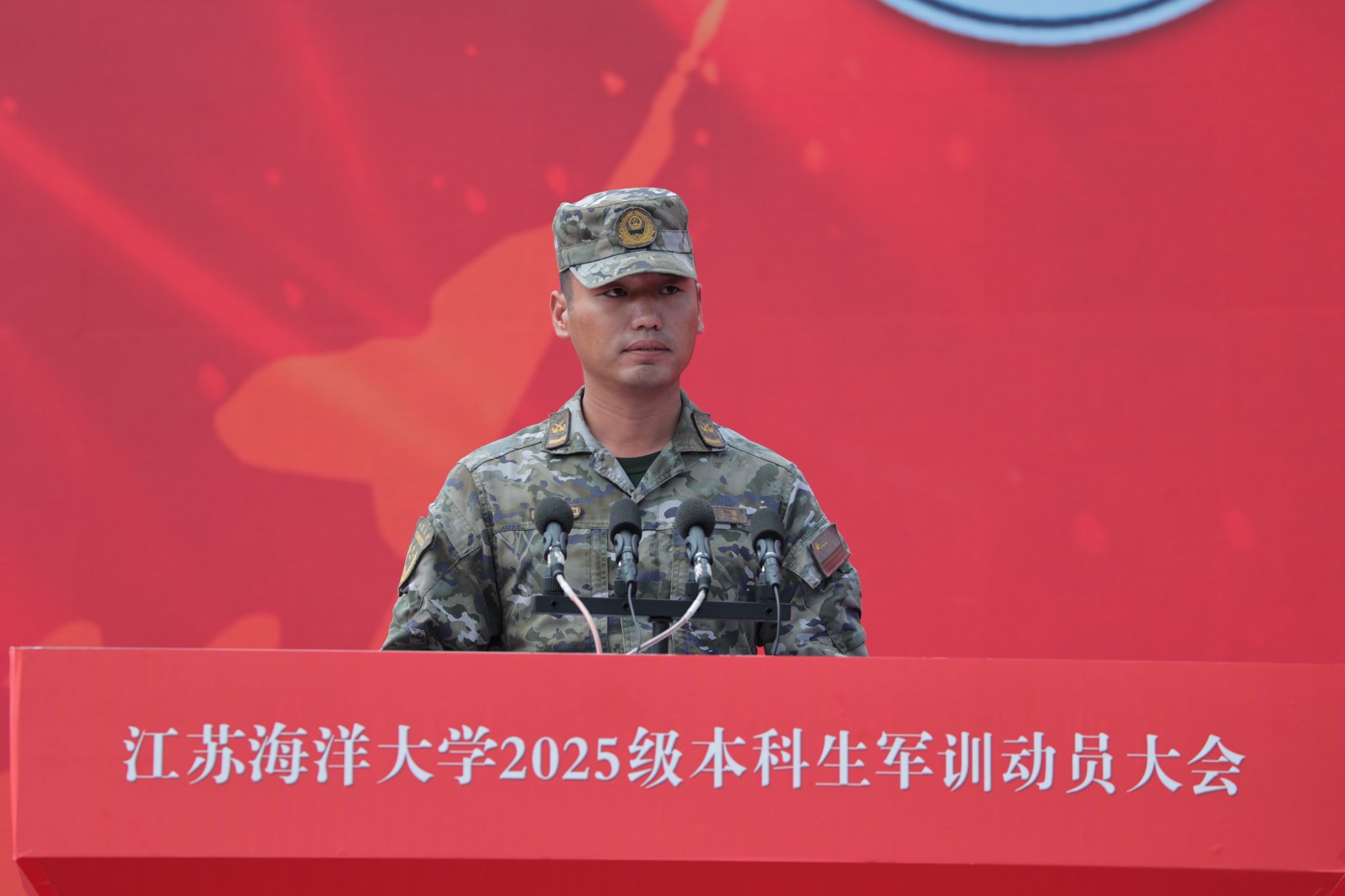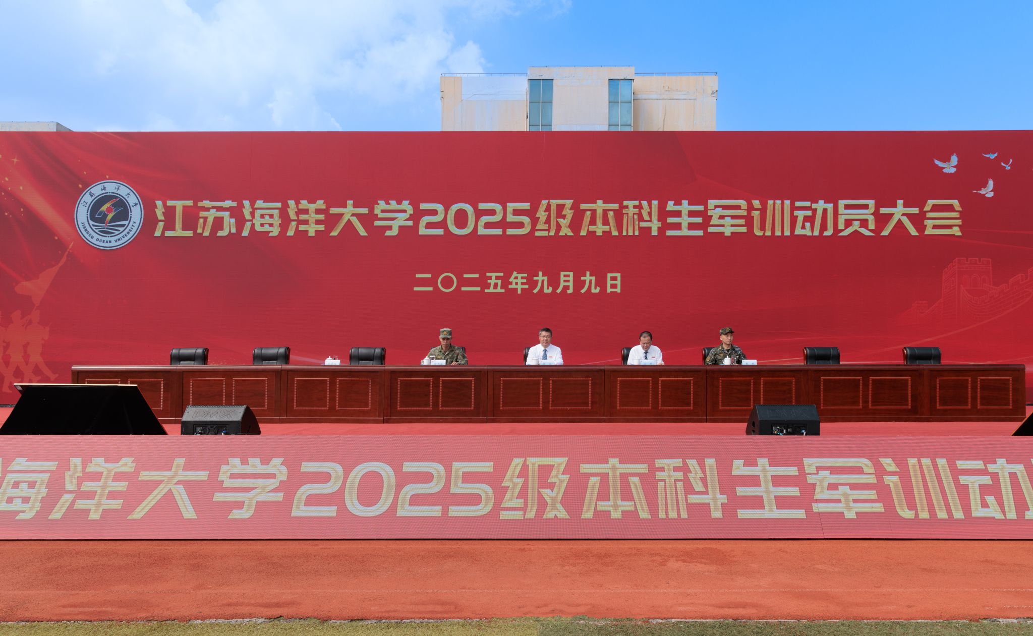9月9日上午,我校2025级本科生军训动员大会在苍梧校区举行。校党委书记许峰,校长汤建,连云港警备区战备建设处副处长谢观林,武警连云港支队副参谋长张鹏出席大会。副校长、军训旅政委马廷淮主持大会。校军训工作领导小组成员,承训部队教官,军训指导员及2025级军训学员参加了动员大会。