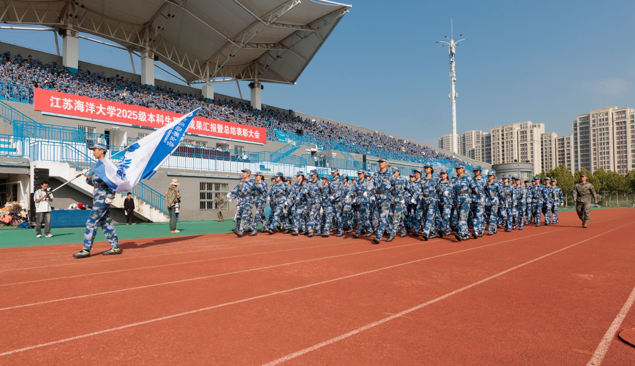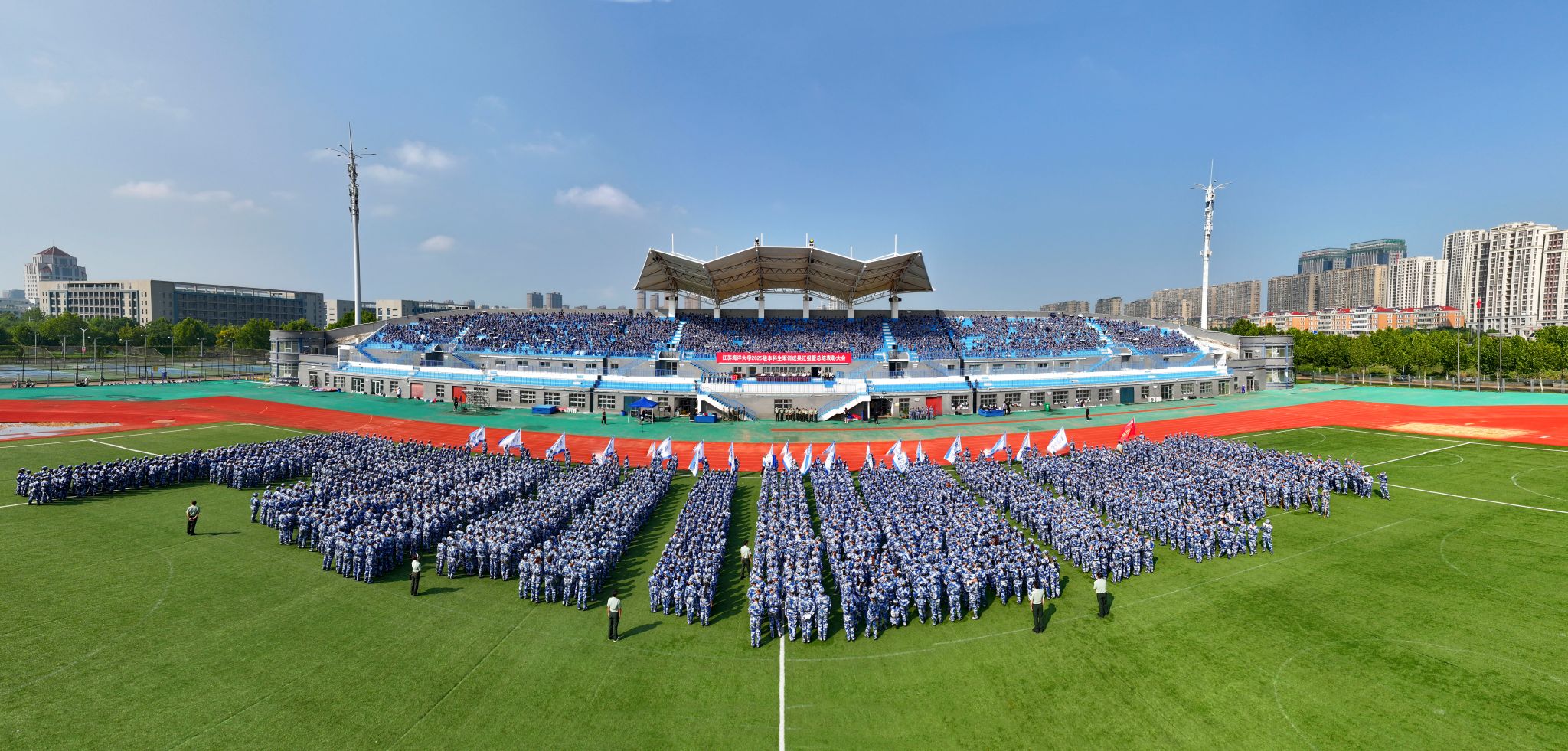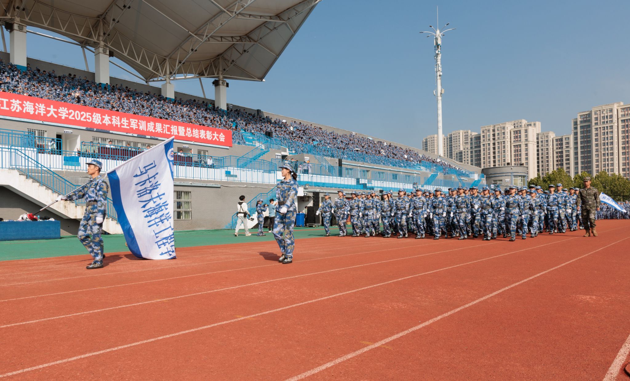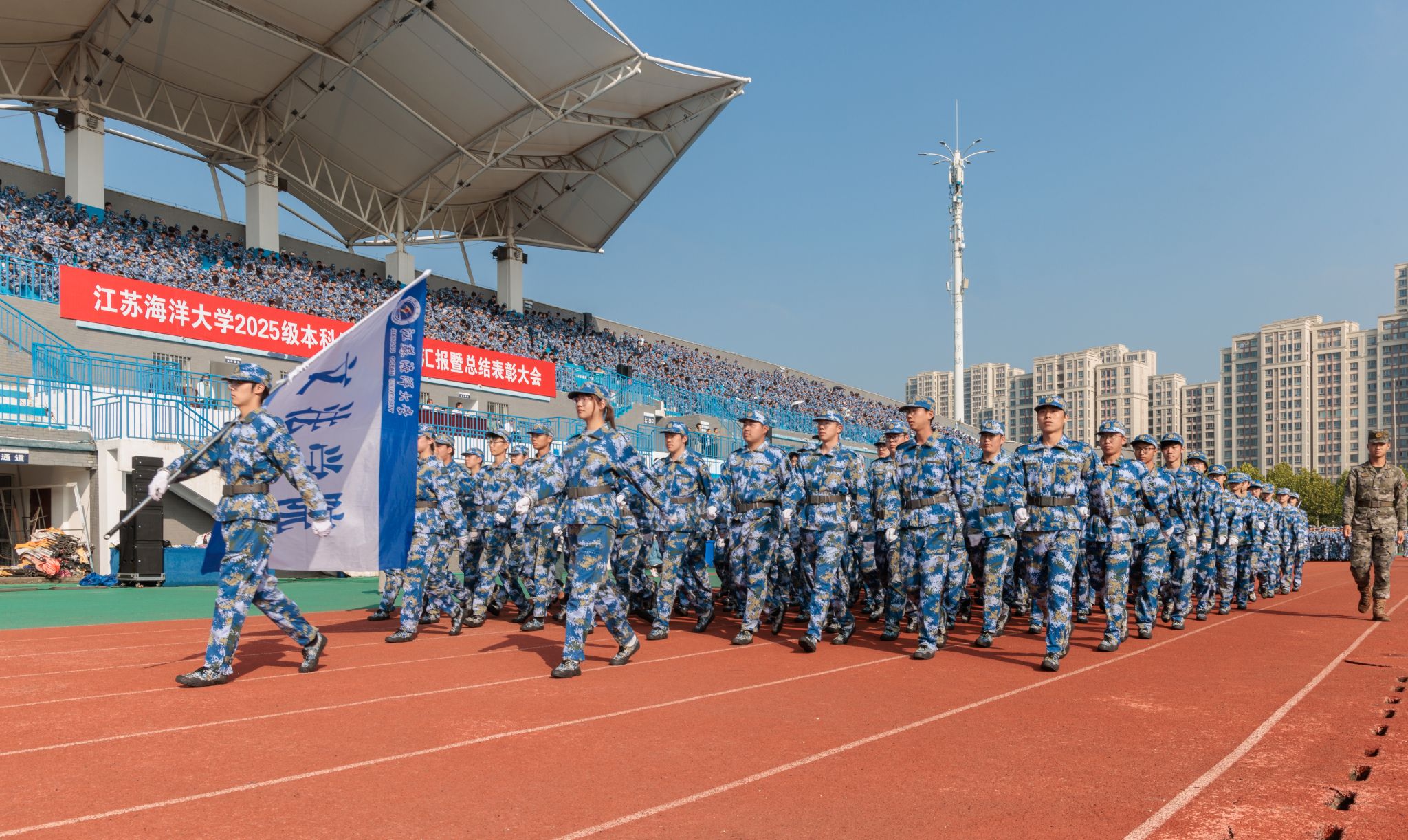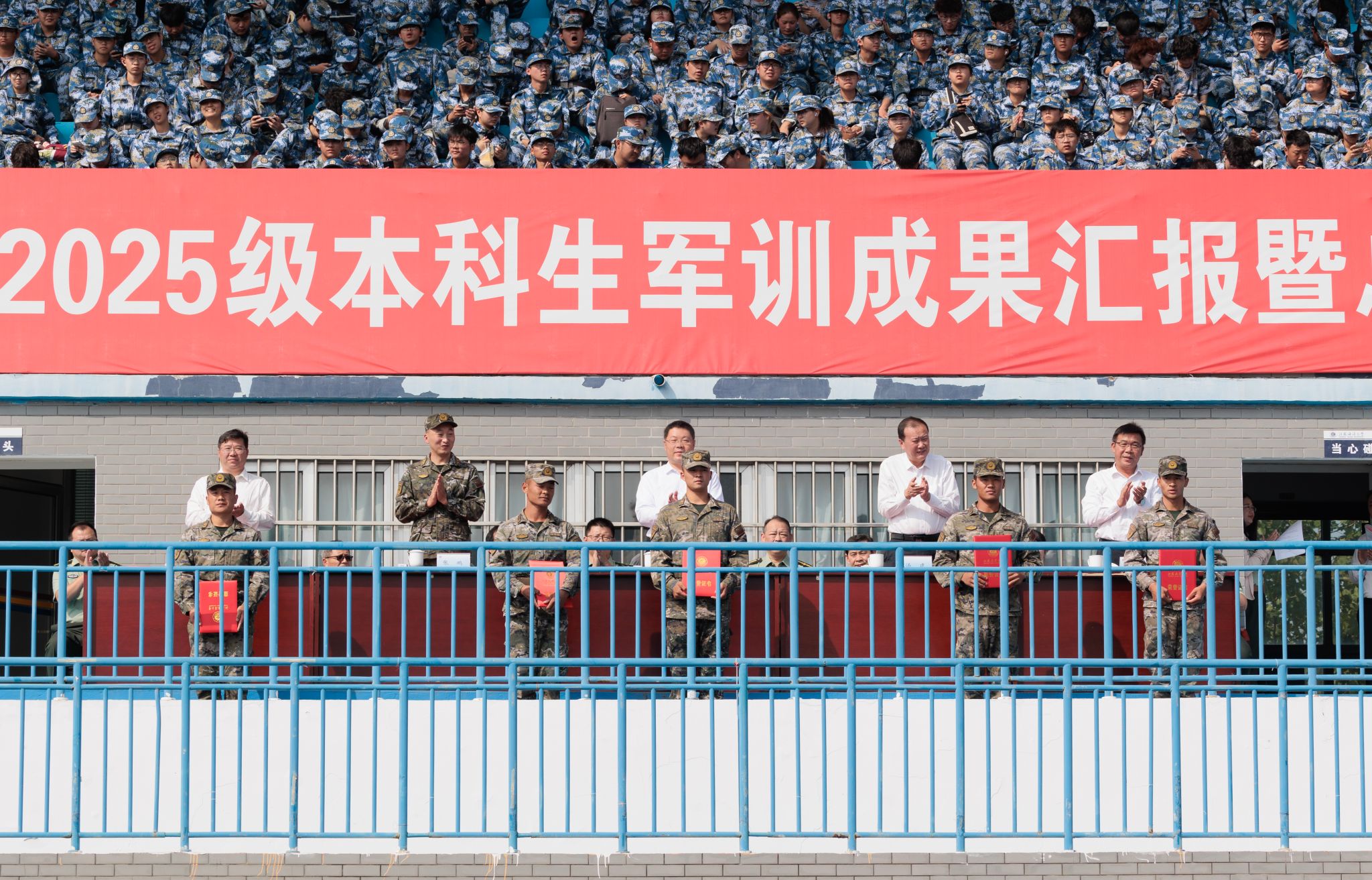 9月20日上午,时值第25个全民国防教育日,我校2025级本科生军训成果汇报暨总结表彰大会在苍梧校区东运动场举行。校党委书记许峰,校长汤建,副校长、2025级本科生军训旅旅长郑利军,副校长、2025级本科生军训旅政委马廷淮出席大会。承训部队武警连云港支队副参谋长张鹏及全体教官,校军训工作领导小组成员,军训指导员和2025级军训学员共同参会。郑利军主持大会。