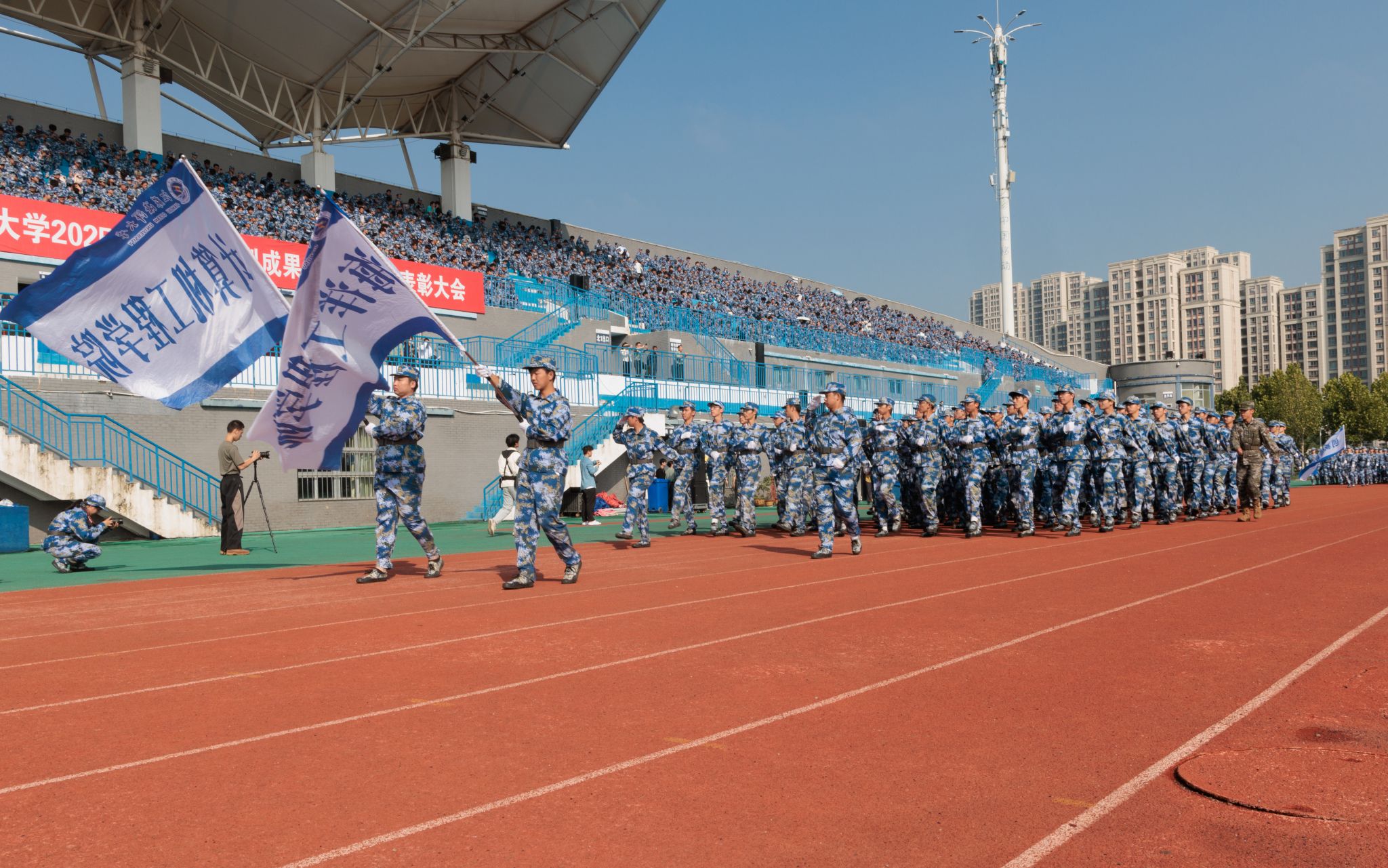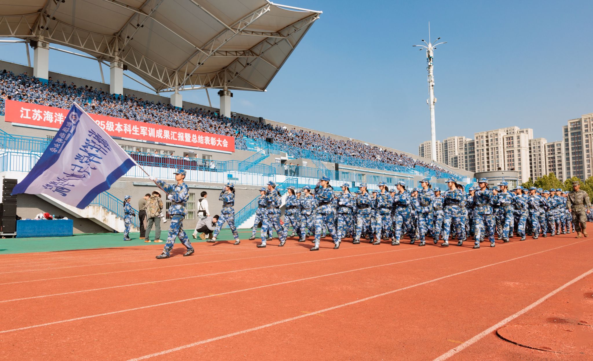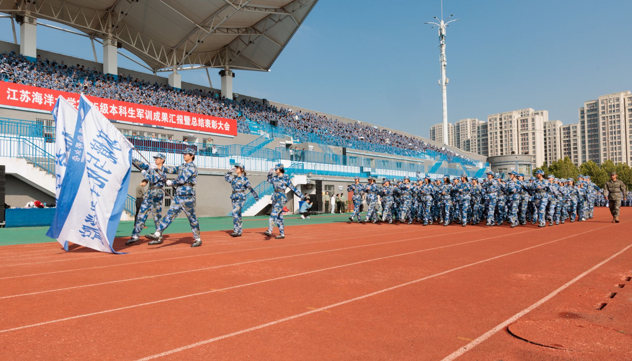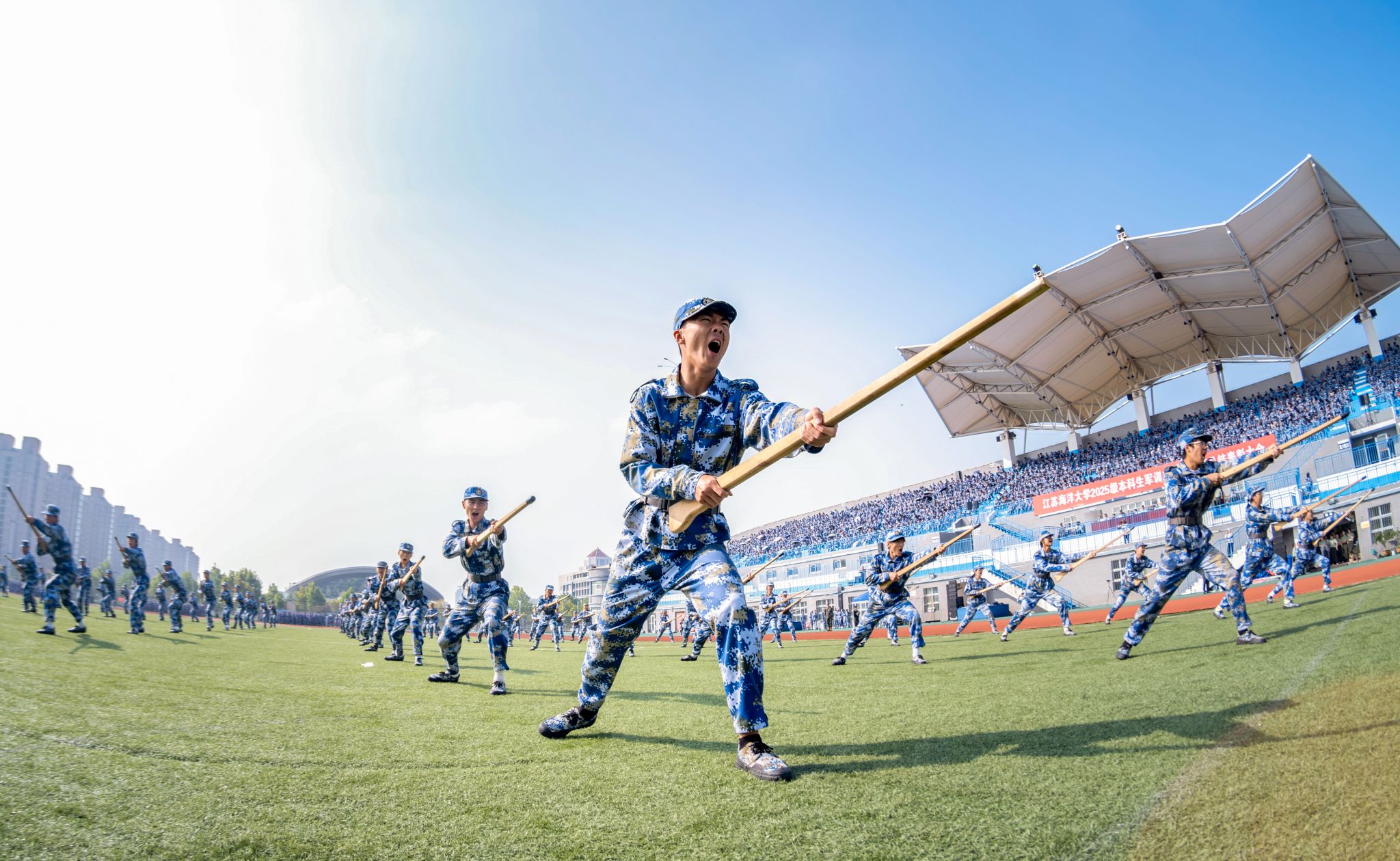 9月20日上午,时值第25个全民国防教育日,我校2025级本科生军训成果汇报暨总结表彰大会在苍梧校区东运动场举行。校党委书记许峰,校长汤建,副校长、2025级本科生军训旅旅长郑利军,副校长、2025级本科生军训旅政委马廷淮出席大会。承训部队武警连云港支队副参谋长张鹏及全体教官,校军训工作领导小组成员,军训指导员和2025级军训学员共同参会。郑利军主持大会。