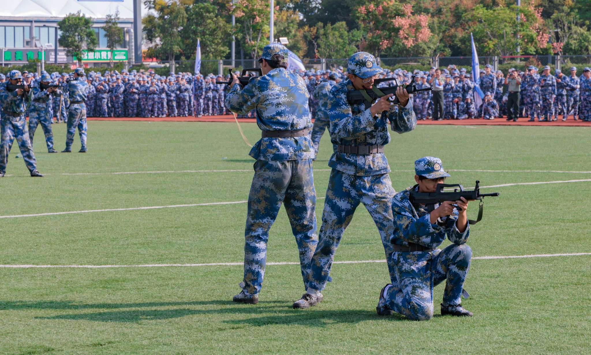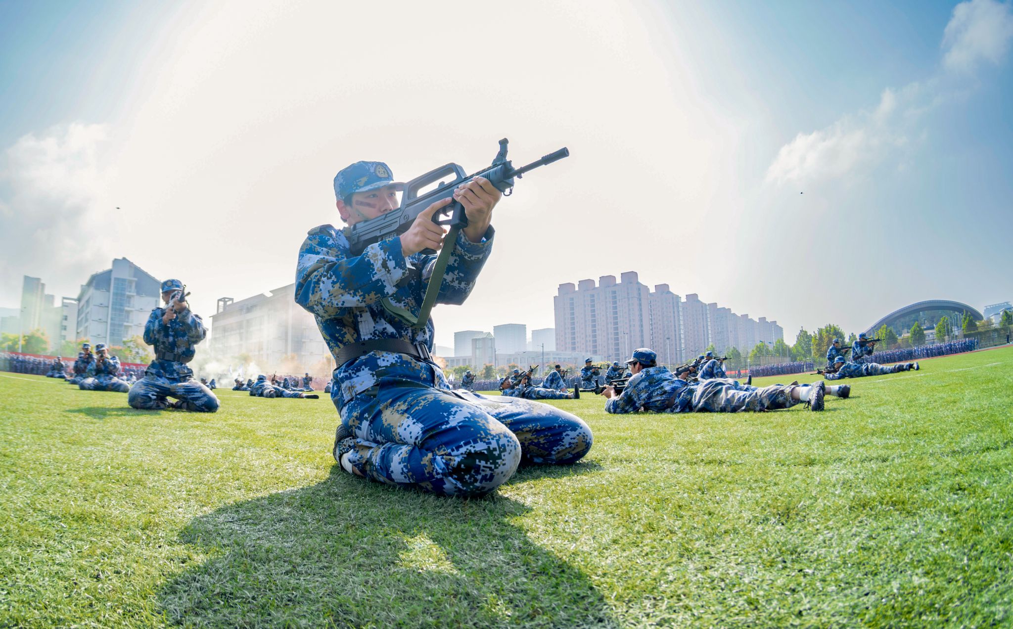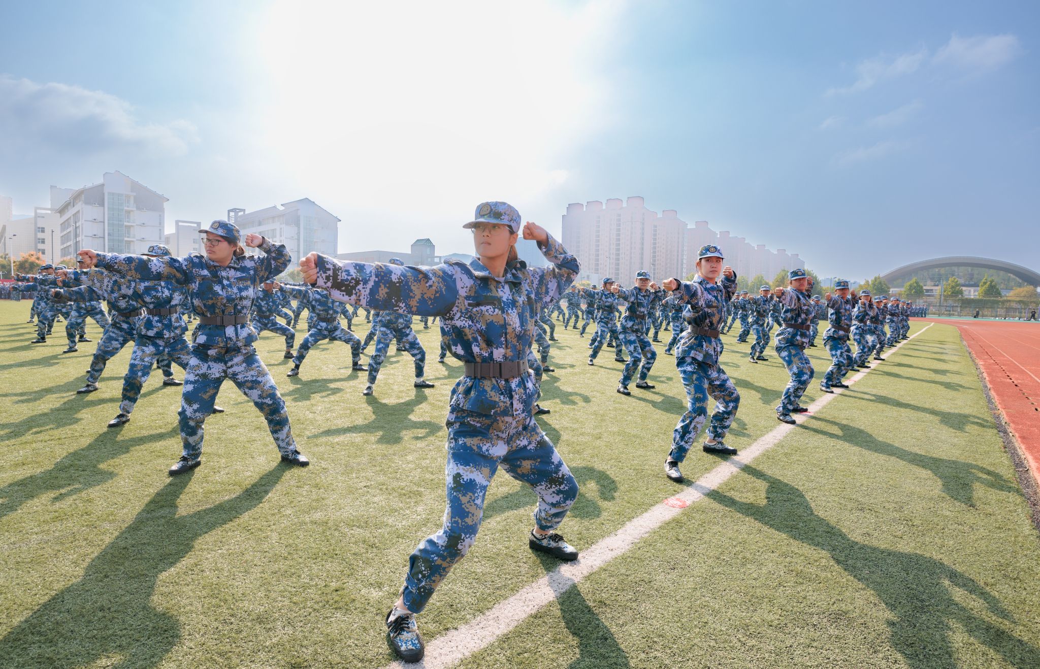 大会在庄严的国歌声中拉开帷幕。挺拔的军姿、铿锵的步伐、嘹亮的口号,分列式方阵以昂扬之姿依次通过主席台,全面展示两周以来的军训成果。紧随其后,擒敌拳、健身操、匕首操、刺杀操、战术等实战化科目进行展示,同学们动作刚劲、气势如虹,充分展现了2025级学子积极向上、意气风发的精神风貌。