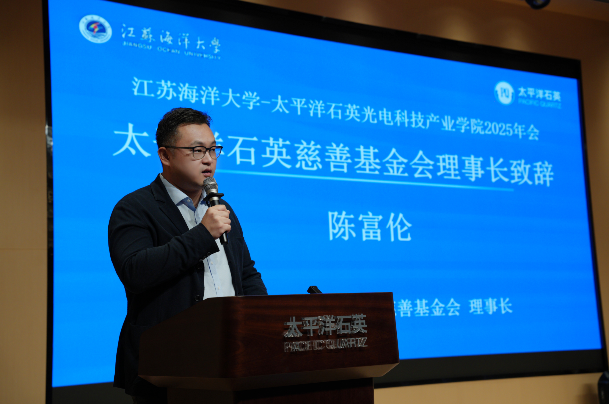 10月15日下午,江苏海洋大学-太平洋石英光电科技产业学院一届二次理事会暨2025年会在江苏太平洋石英股份有限公司召开。江苏海洋大学校长汤建,副校长、产业学院院长马廷淮,江苏太平洋石英股份有限公司总裁陈富伦出席会议。江苏太平洋石英股份有限公司第二事业部总裁刘明伟等校企代表、理学院党政班子、光电信息科学与工程系骨干教师与学生代表共同参会。会议由马廷淮主持。