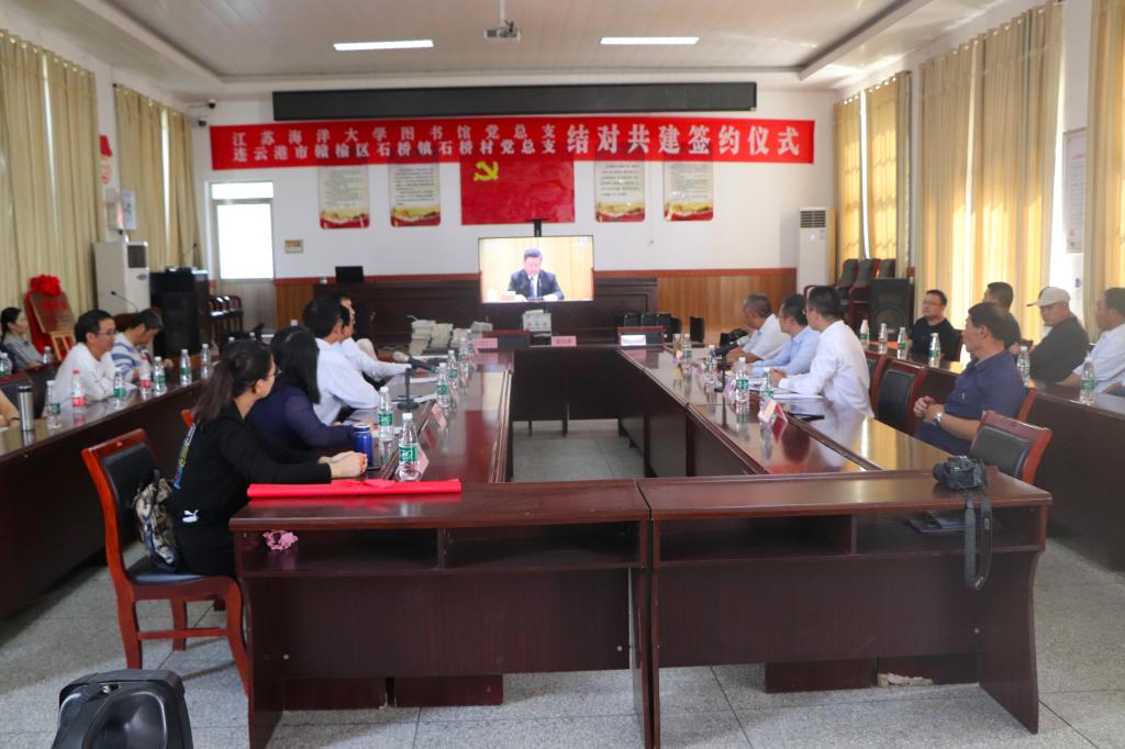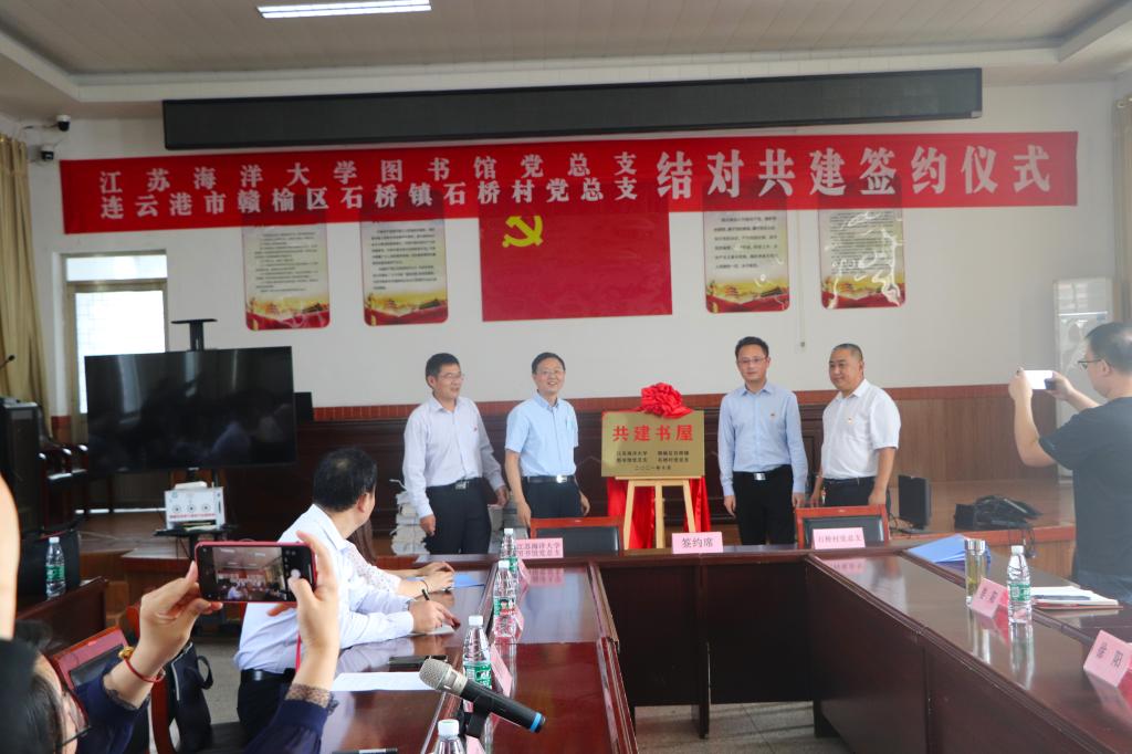 图书馆第一党支部书记王爱、第二党支部书记田为付,与石桥镇石桥村党总支书记签订了结对共建协议书。接着,图书馆党总支向连云港赣榆区石桥镇石桥村党总支捐赠了部分书籍和电脑用品,双方为“共建书屋”揭牌。