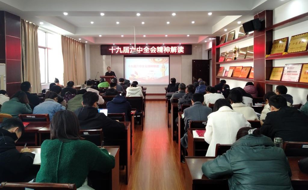 11月24日下午,文法学院党委副书记王国银在文渊楼314为文法学院全体教职工解读党的十九届六中全会精神。吴明忠主持会议,全体教职工参加会议。