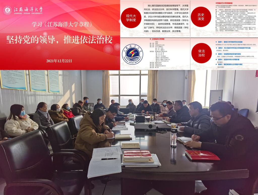 为进一步增强党员法治观念和深入学习《江苏海洋大学章程》,推动树立法治意识和提升师德师风修养,12月22日下午,机关党委第十七支部开展“坚持党的领导,推进依法治校”专题党课,信息化中心主任黎汉杰主讲。会议由信息化中心副主任、机关党委第十七支部书记伍俊明主持,信息化中心全体教职工参加。