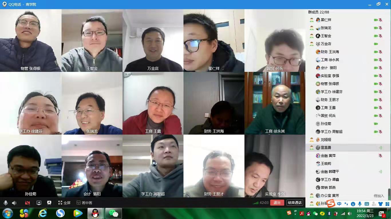 3月23日晚,商学院党委理论学习中心组通过QQ群视频召开线上学习会议。全体院领导、支部书记、系部负责人等20余人参加会议,会议由院党委书记万金店主持。